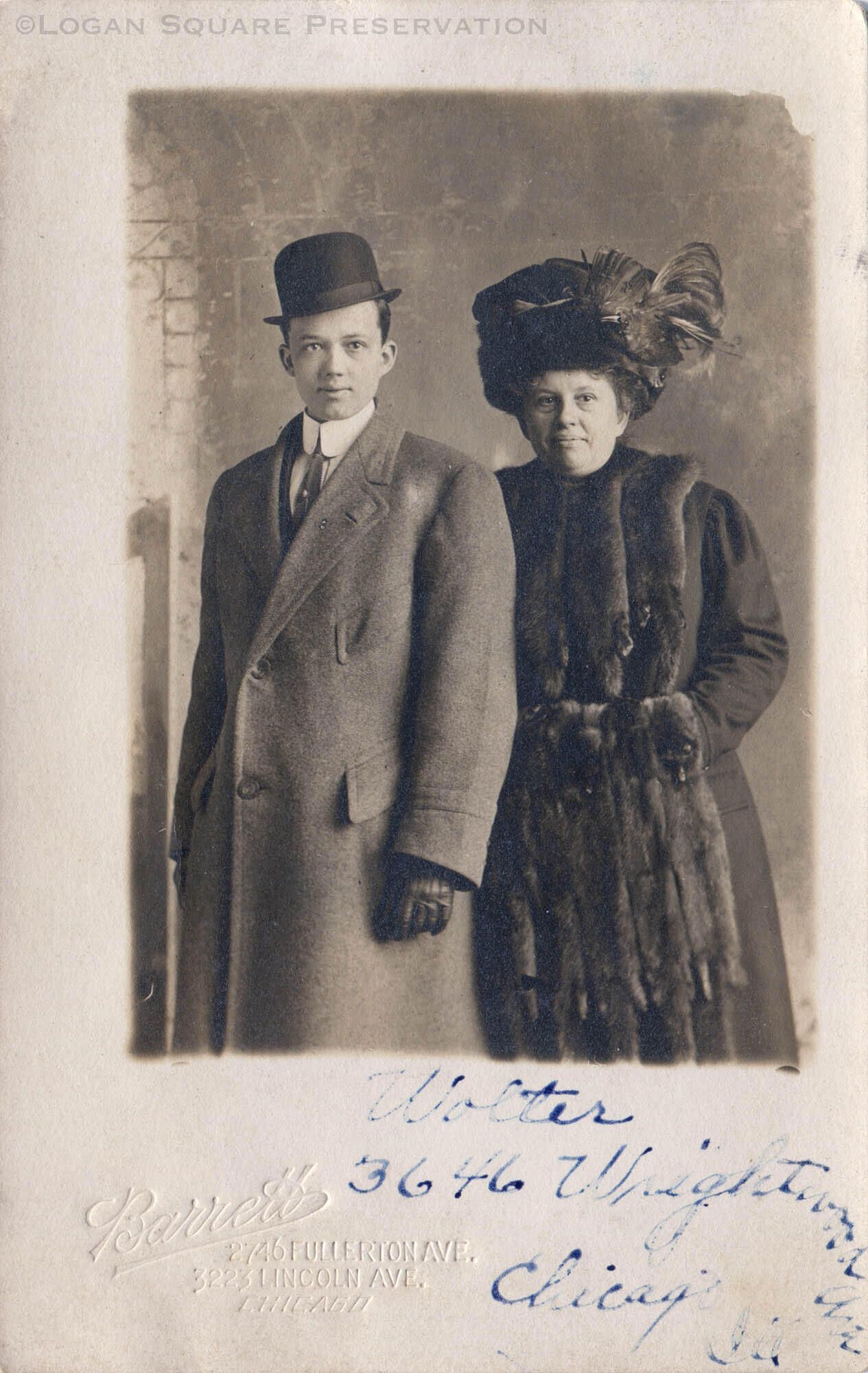 Real-photo studio portrait postcard of woman wearing mink coat and elaborate hat with young man wearing long coat and derby hat by Barrett photo studio, sent by Wolter family at 3646 W. Wrightwood circa 1910Subject Place