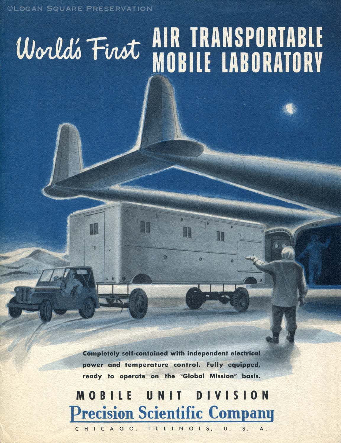 8-pg booklet promoting Precision Scientific Company mobile science laboratory with layout diagrams and specifications, includes brief history of company and photo of building facade, circa 1947Publication Details