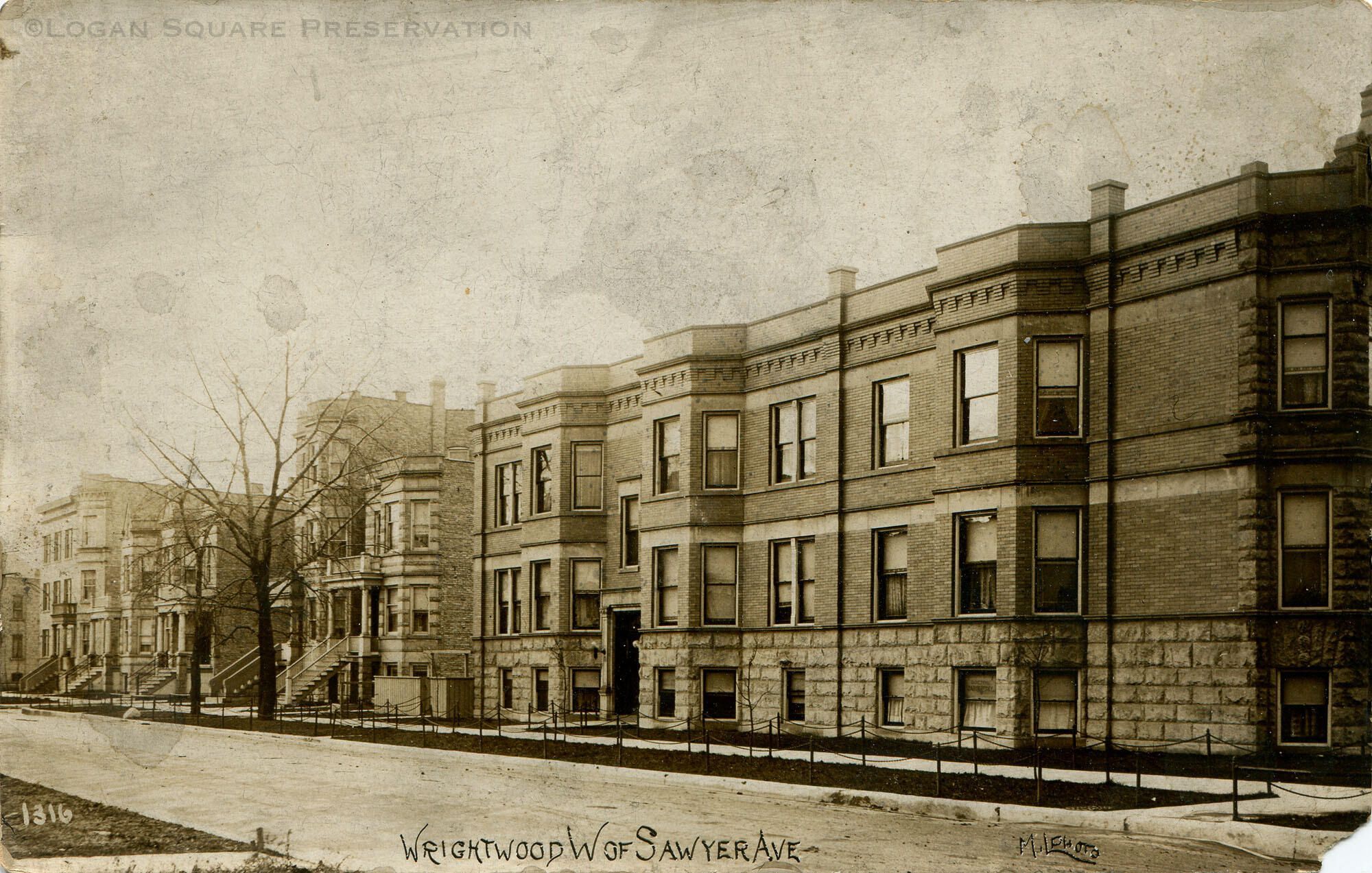 Real-photo postcard view looking northwest at 2600 N. Sawyer and buildings west along Wrightwood Ave.Subject