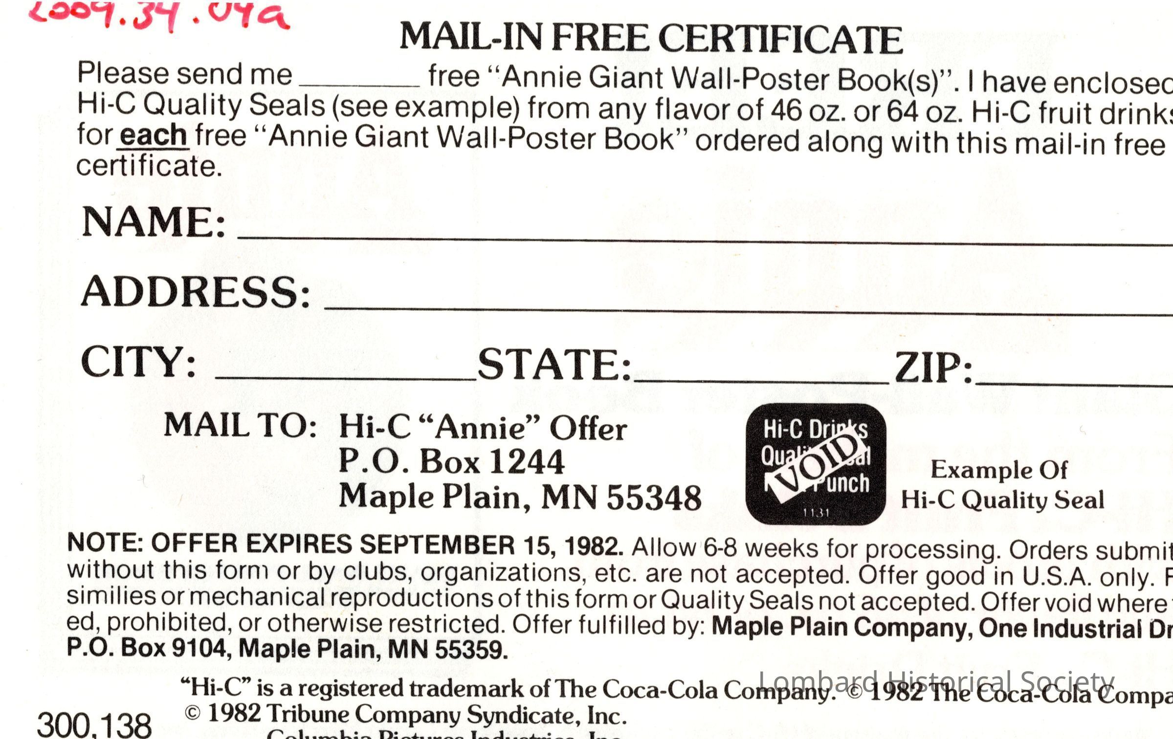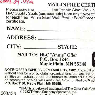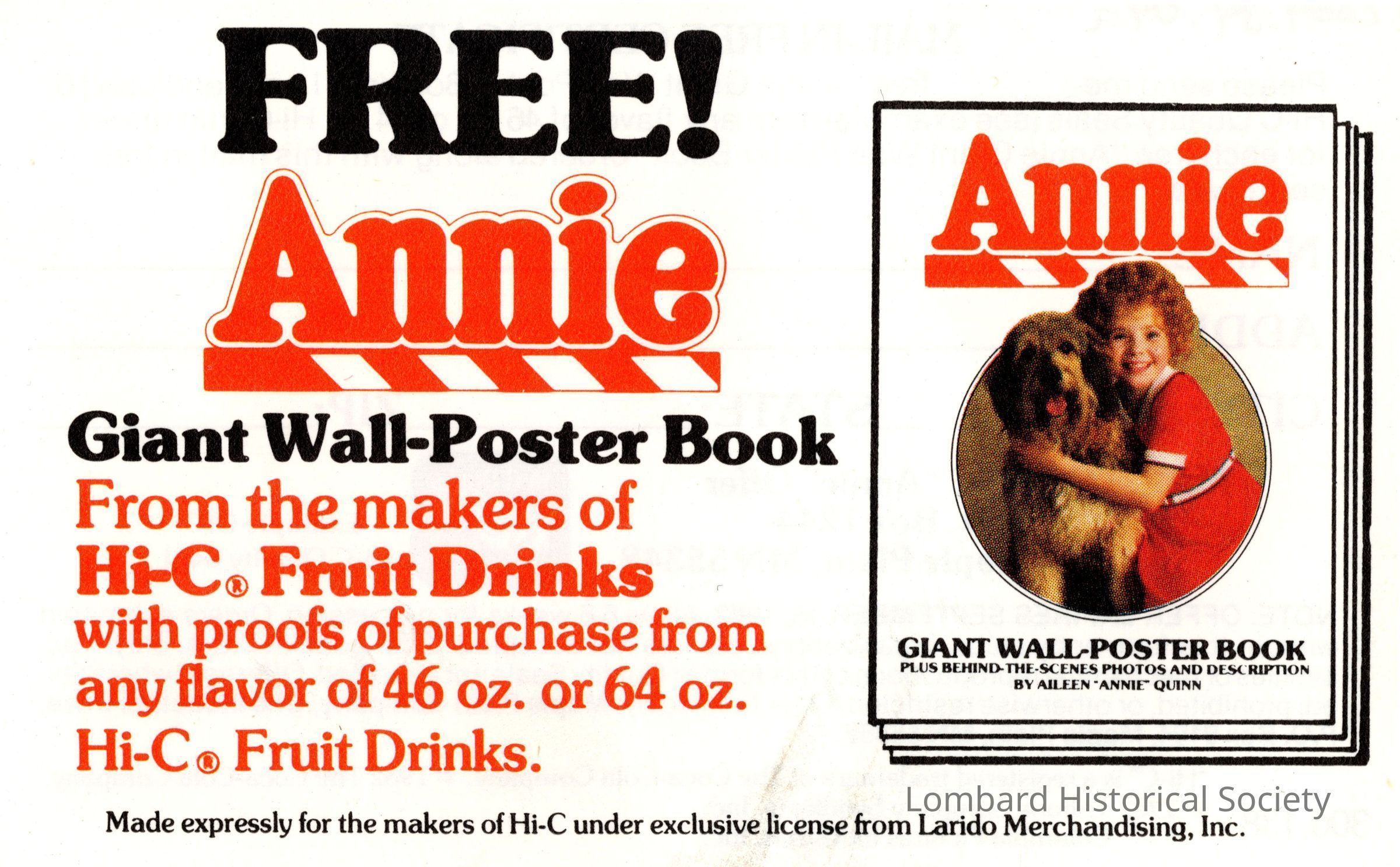 Advertisement for movie poster for 1982 Annie movie created by Hi-C and Coca Cola company.Context