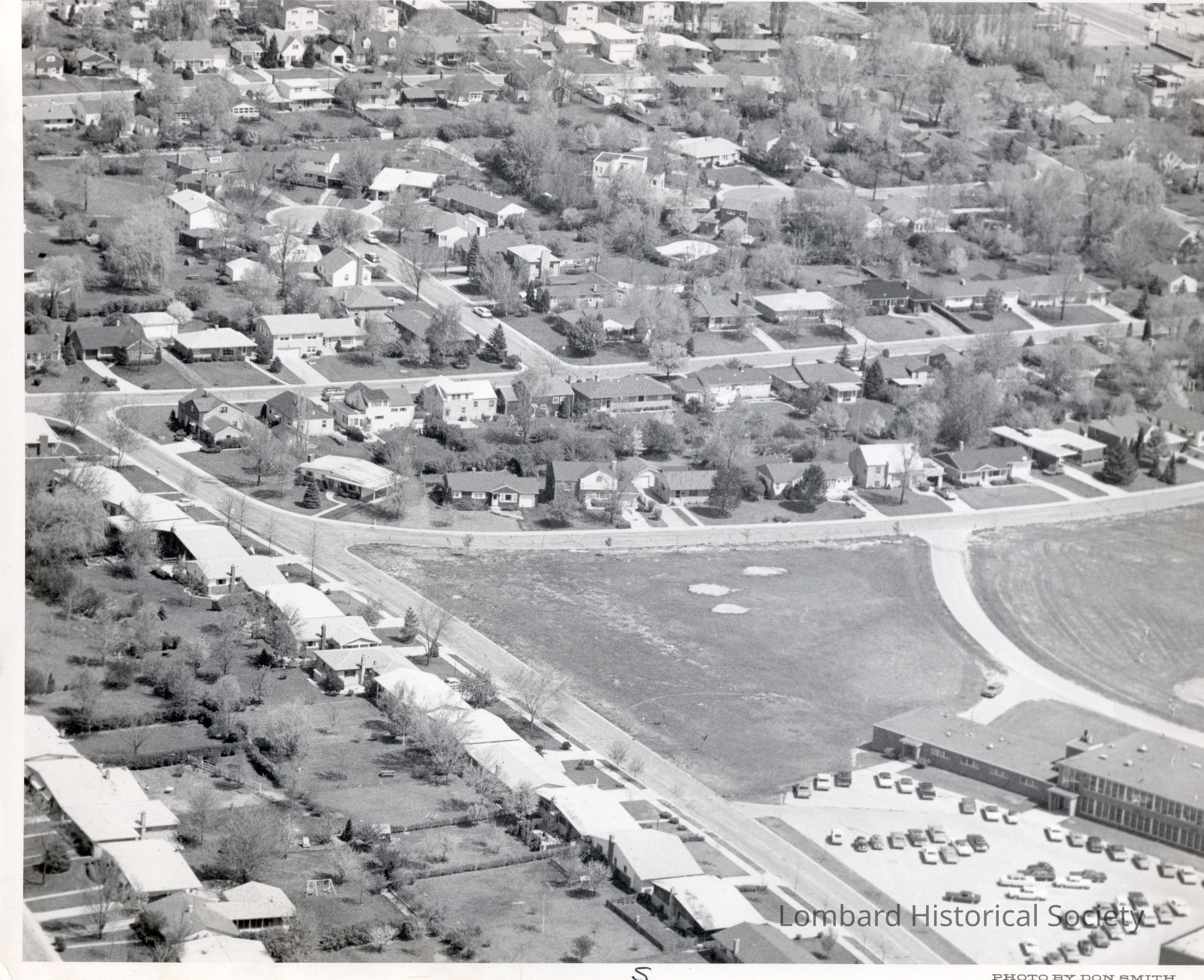 Aerial photo taken of Lombard in the 1970s. Pictured is West Washington Boulevard, Green Valley Drive, and Lincoln Court. Bottom right hand is Lombard Junior High School.Collection