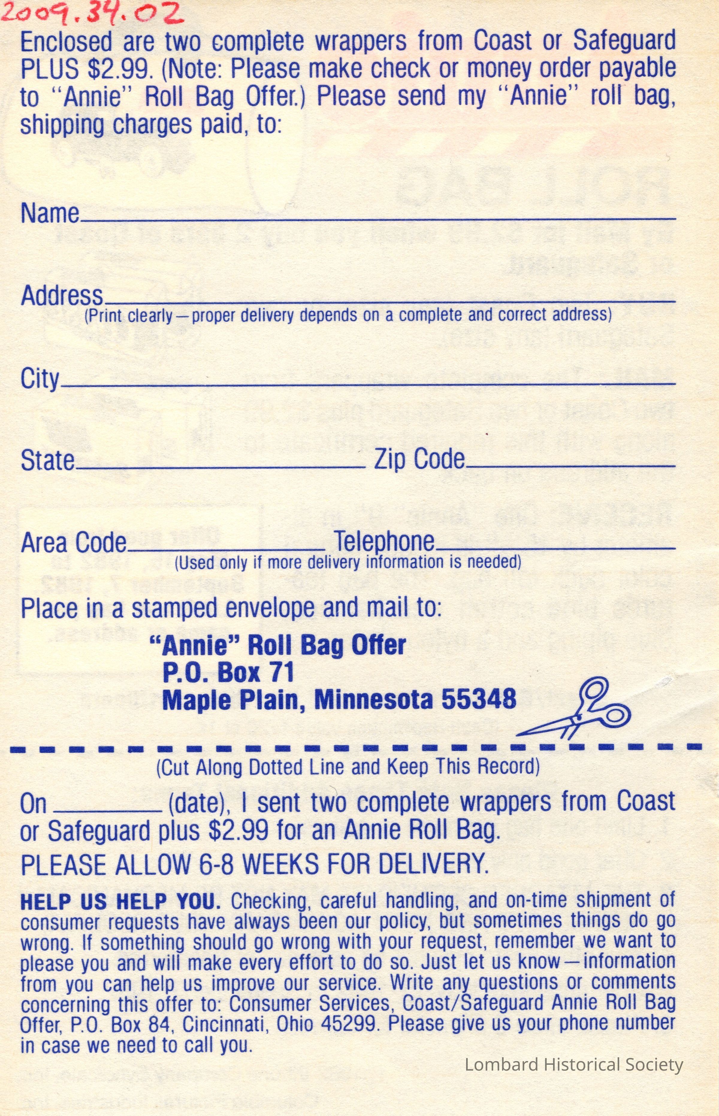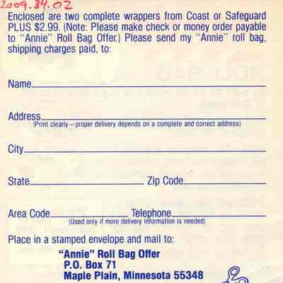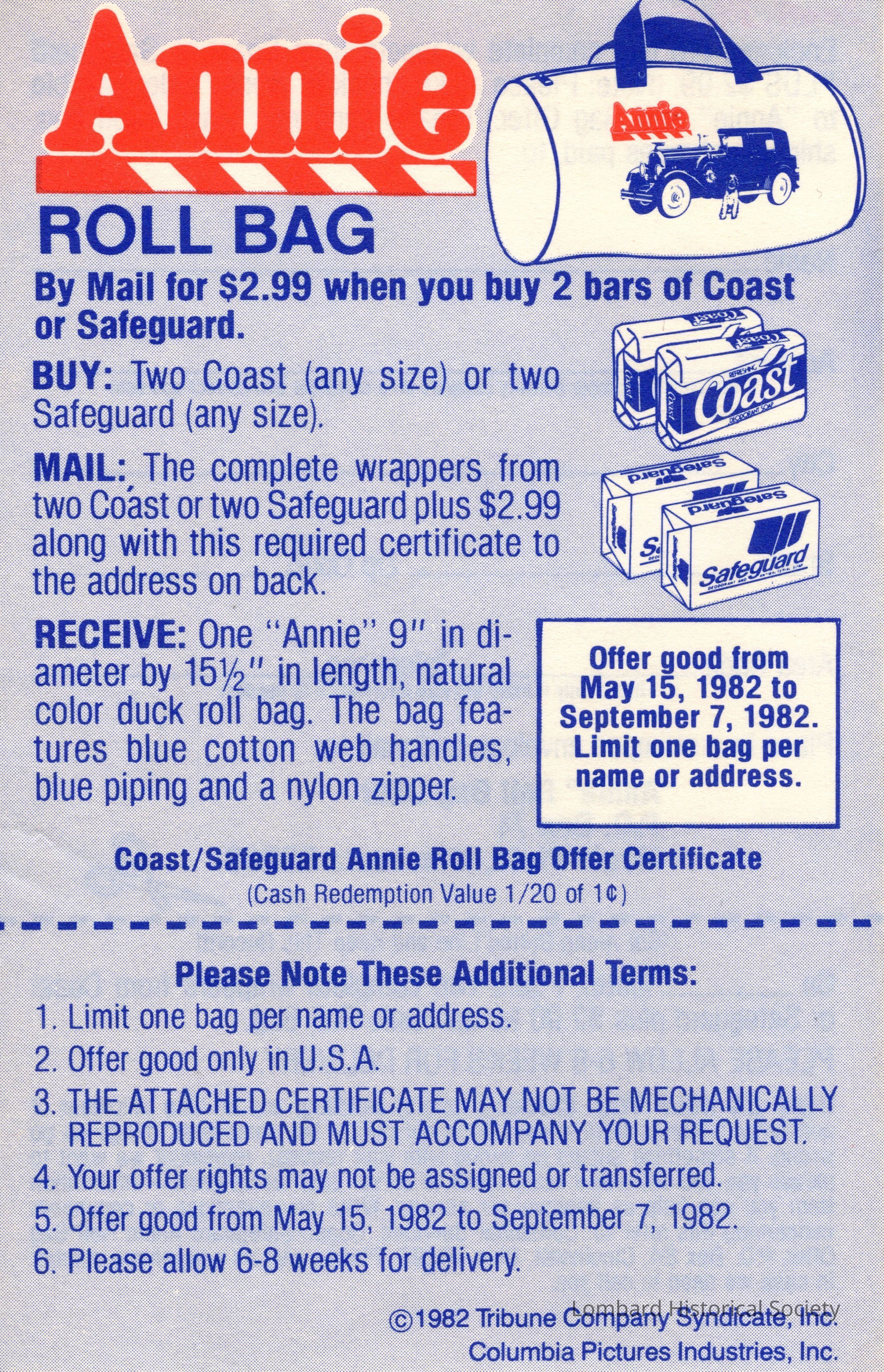 Advertisement for the 1982 movie musical Annie, for a roll style duffle bag. This bag was a partnership between Coast /Safeguard Soap, Tribune, and Columbia Pictures to promote the 1982 movie musical.Context