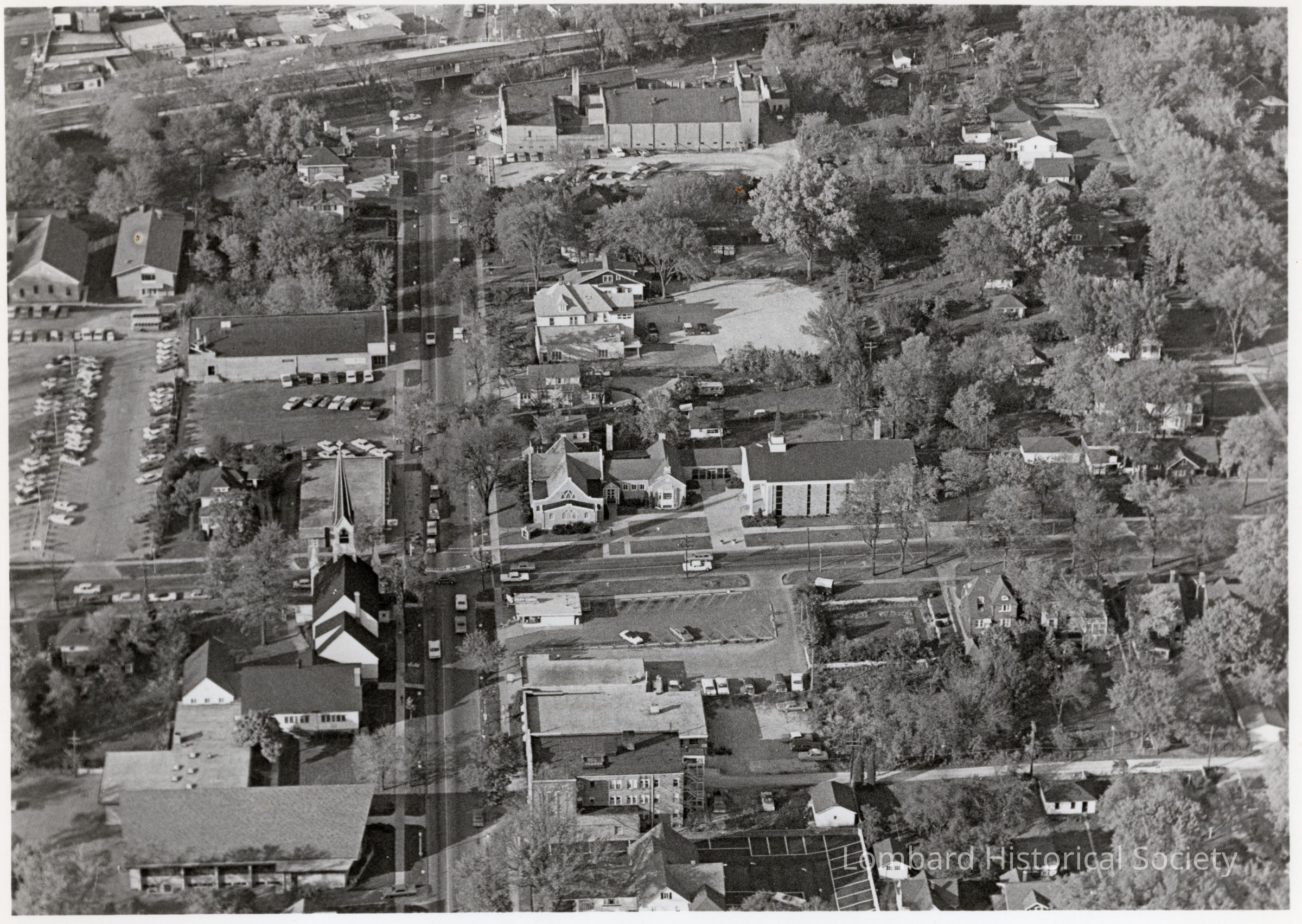 Aerial view of the Main Street and Maple Street area taken in the 1970s. Pictured are First Church of Lombard, First United Methodist Church, Dairy Queen, DuPage Theater and the Chicago Northwestern RailroadCollection