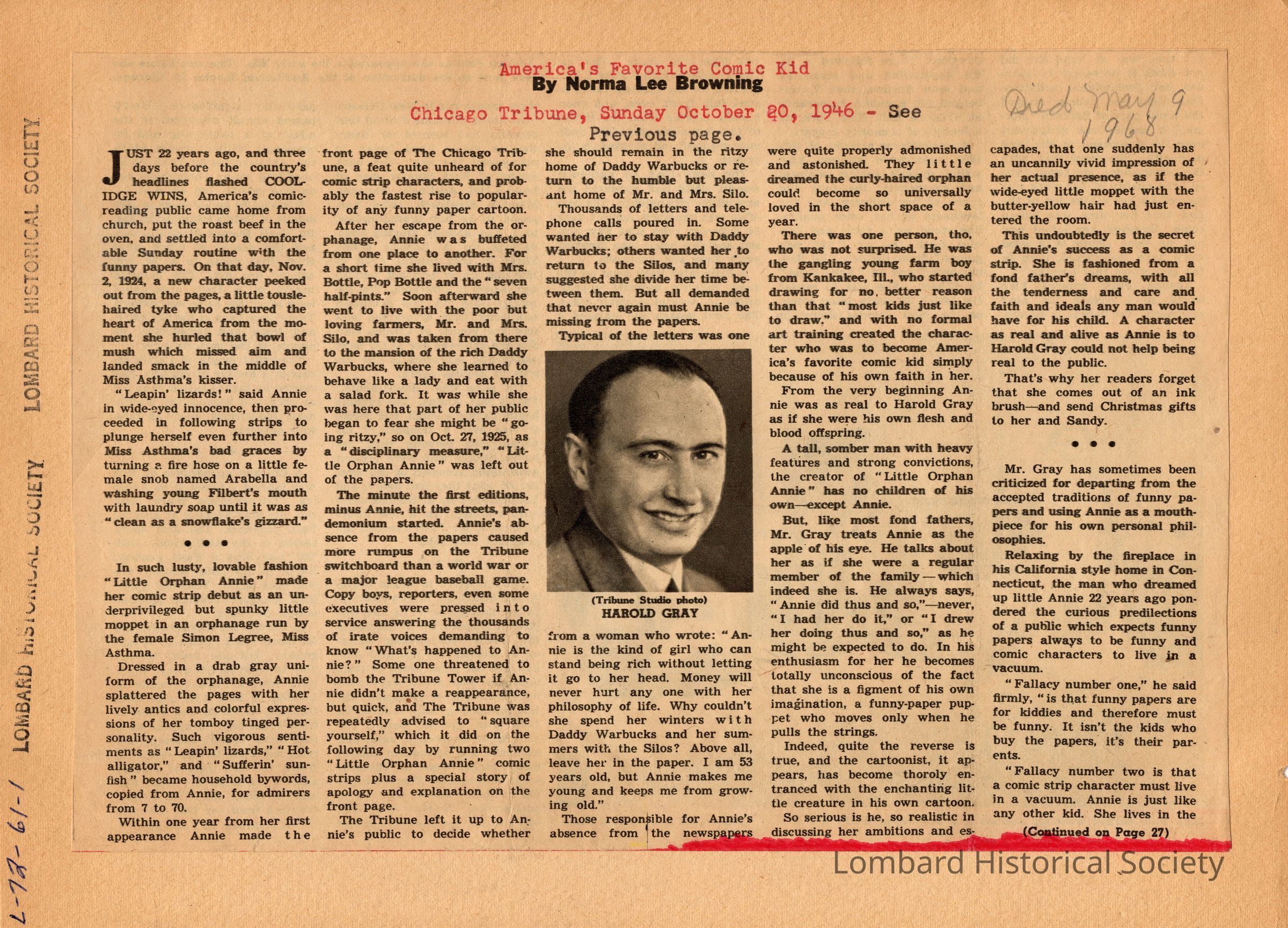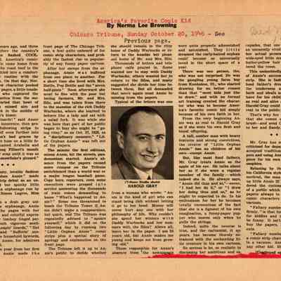 Front and back News paper clipping celebrating "America's Favorite Comic Kid." Published October 20, 1946. The article was written by Norma Lee Browning. Includes several quotes from Gray regarding his philosophy in creating his comic strips.Context