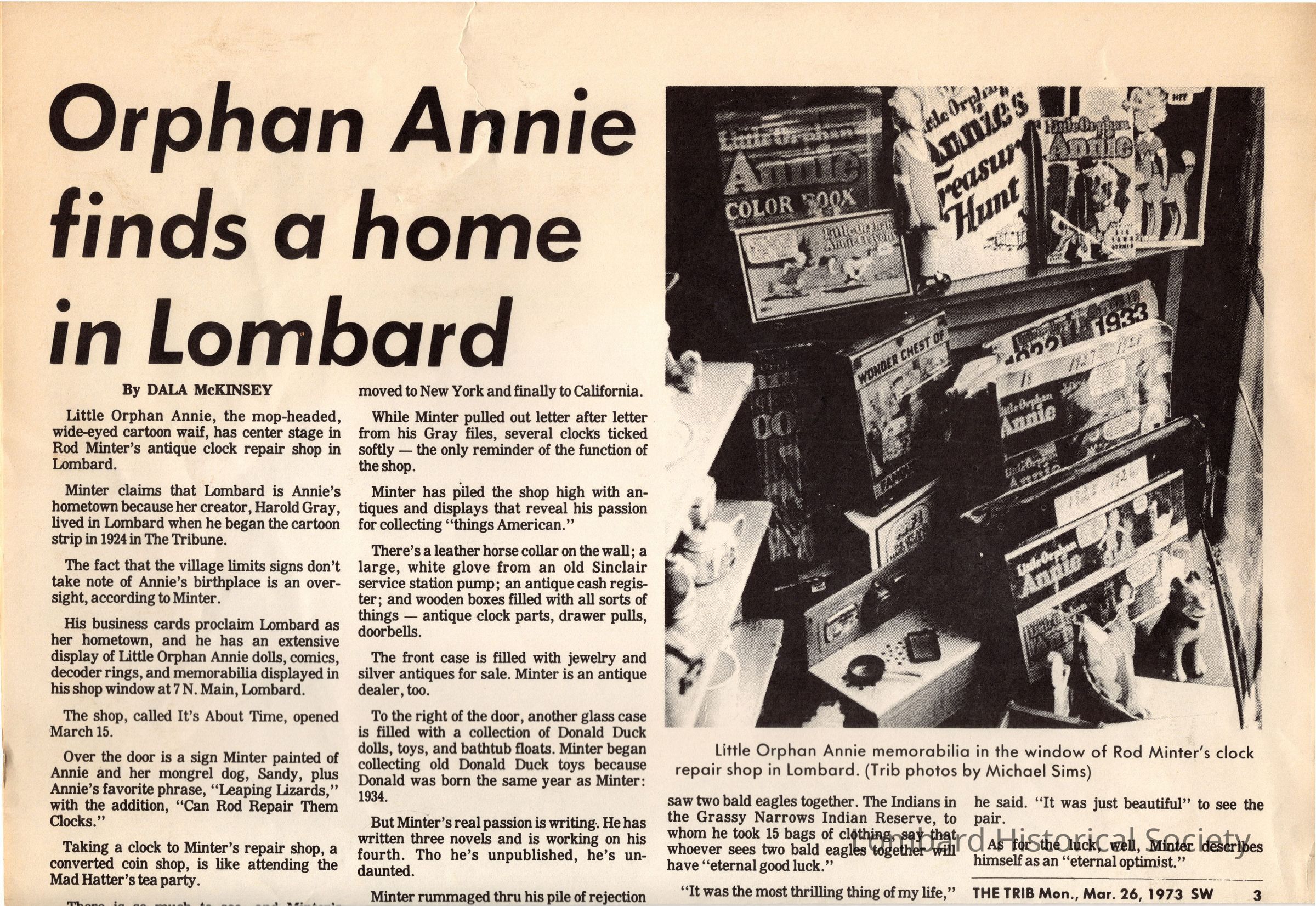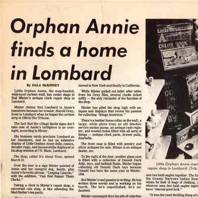 Harold Gray lived and met his second wife here in Lombard while he created the iconic comic strip character. This article and advertisement appears in Lombard to celebrate the 50th Anniversary in 1974. Lombard sold many commemorative items.Collection