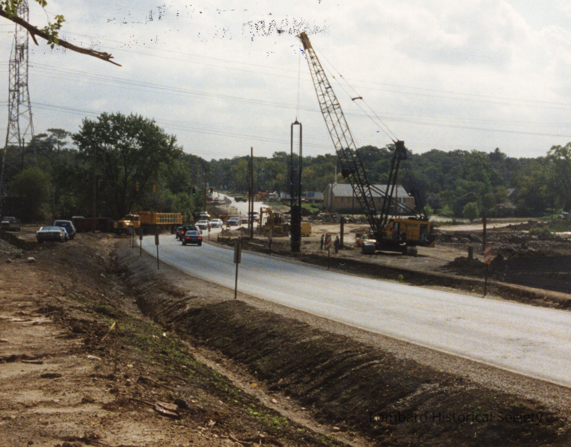View East showing temporary St. Charles Road (Lake Street) bypass at route of new tollway, I-355. Baptist Church at the corner of Route 53 (Columbine Avenue) and St. Charles Road (Lake Street) is in the center background.Collection