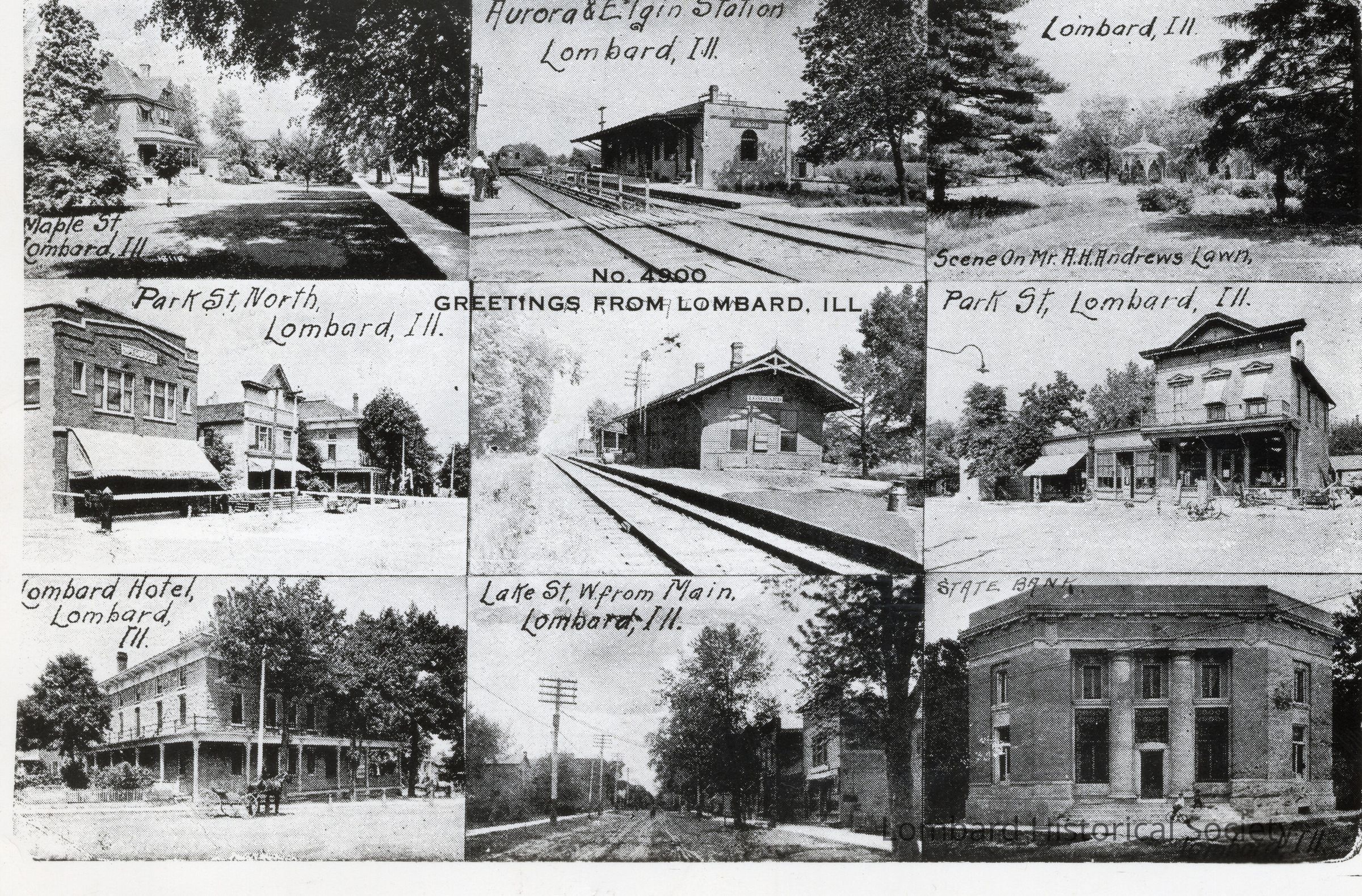 Photo of postcard featuring 9 views of Lombard: Maple Street, Chicago Aurora & Elgin Railroad Station, scene on Mr. A.H. Andrews' Lawn, Park Street north, Chicago Northwestern Railroad Station, Park Street, Lombard Hotel, Lake Street (St. Charles Road) looking west from Main Street and the State BankCollection