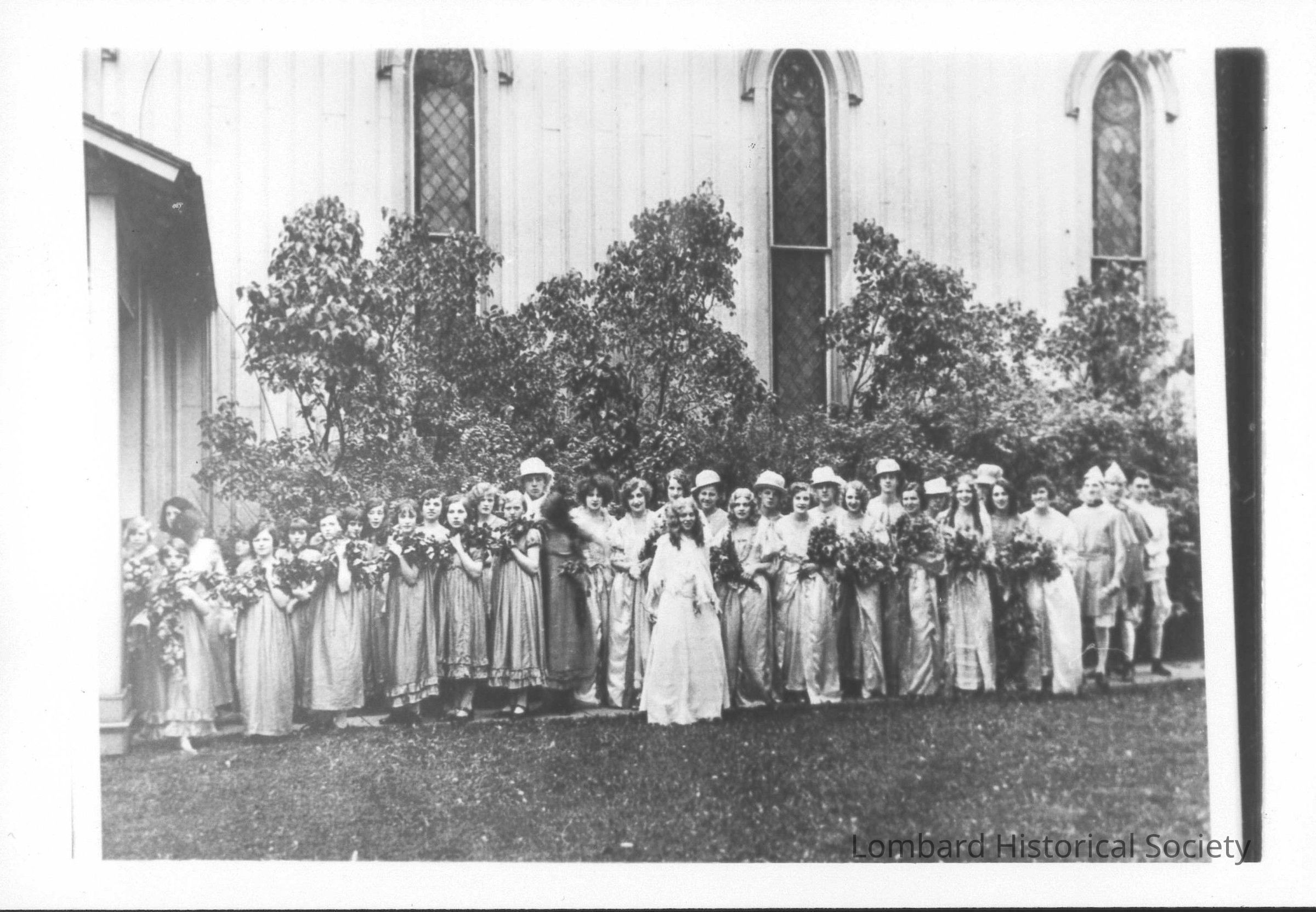 P74-138 Lilac Festival Pageant Members Standing on North Lawn of First Church on the Corner of Maple Street and Main Street in Lombard -- May 17, 1930Entry/Object ID