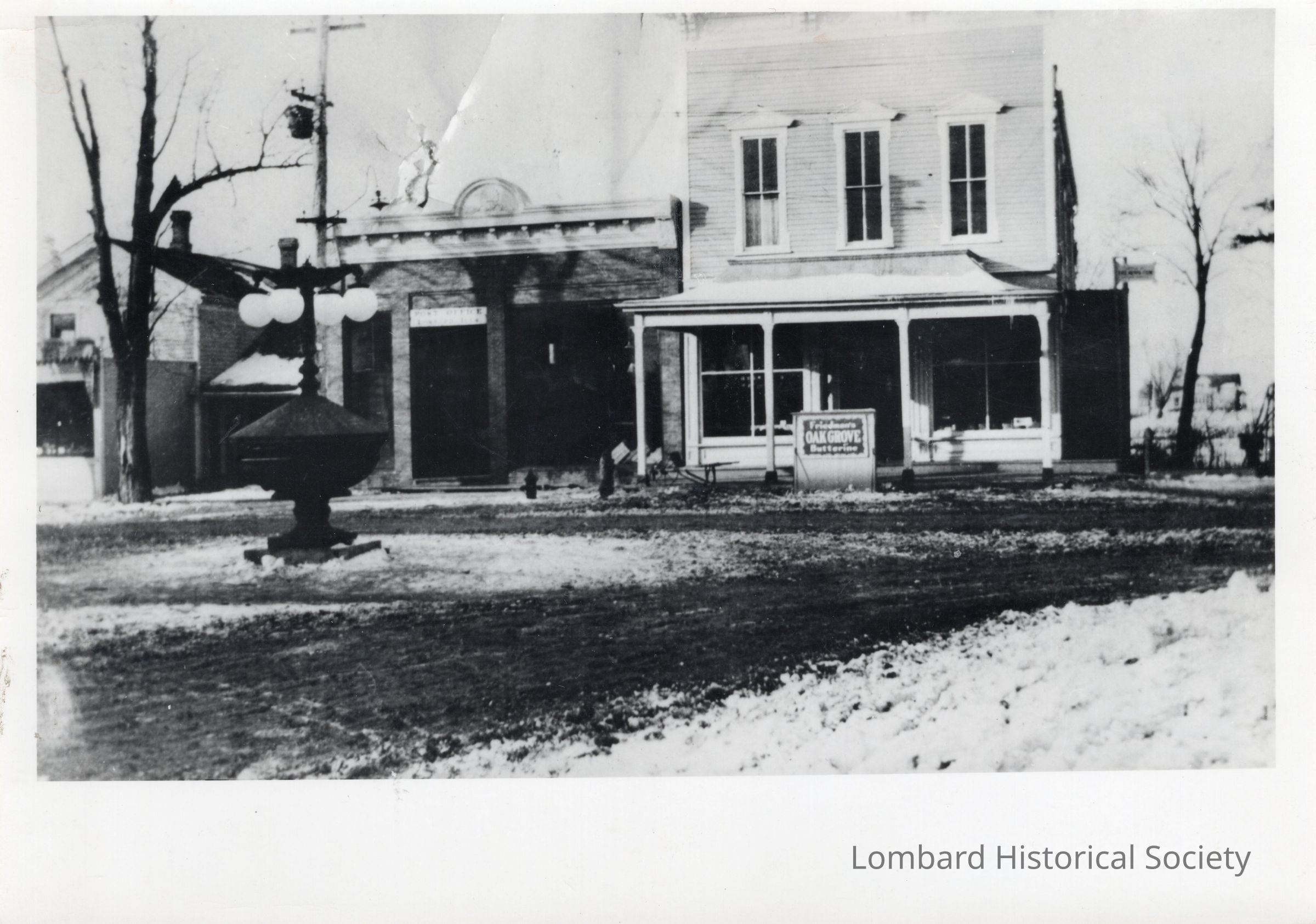 P74-415 North End of Park Avenue Where it Ended at Lake Street (St. Charles Road). Pictured right to left: Hill's Country Store, Fleege's Grocery, Meats & Post Offic, Shore Store (in front of) and the Fleege home.Collection
