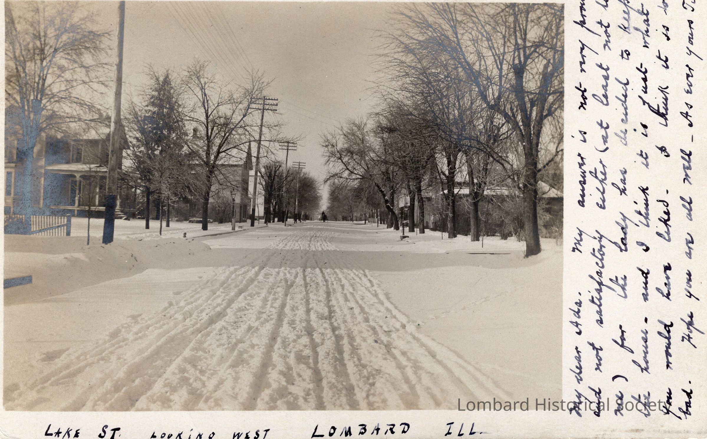 P76-32 Postcard of Lake Street (St Charles Road) Looking West. Note on front of card: My dear Ada. My answer is not my prompt and not satisfactory either (at least not to me) for the lady has decided to keep the house. I think it is just what you would have liked and think it is too bad. Hope you are all well. As every yours Tillie. Postcard mailed to Mrs. B. Abeler, 373 Cleveland Avenue, Chicago, Illinois, and postmarked May 18, 1905.Collection