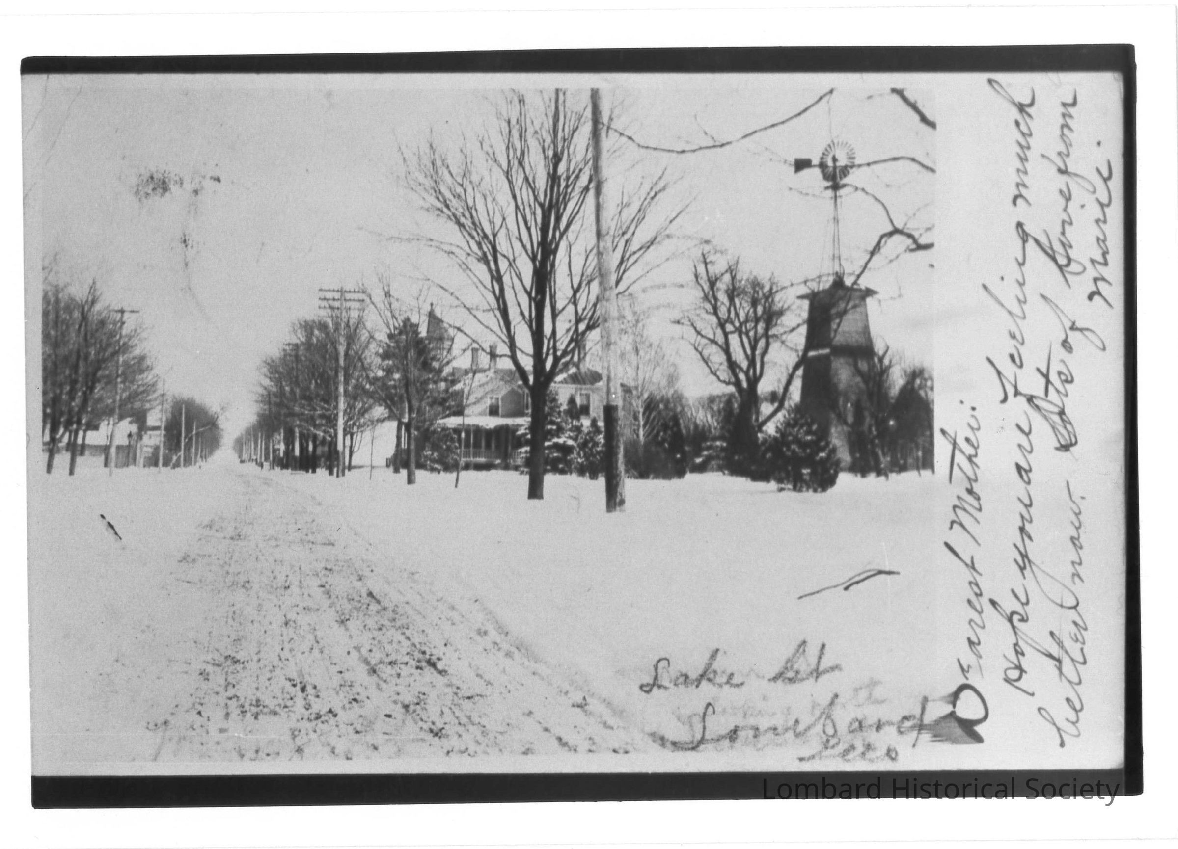 P80-185 Lake Street Looking East from Wrisley Home. Message on side of photo: Dearest Mother: Hope you are feeling much better now. Lots of love from Marie.Collection