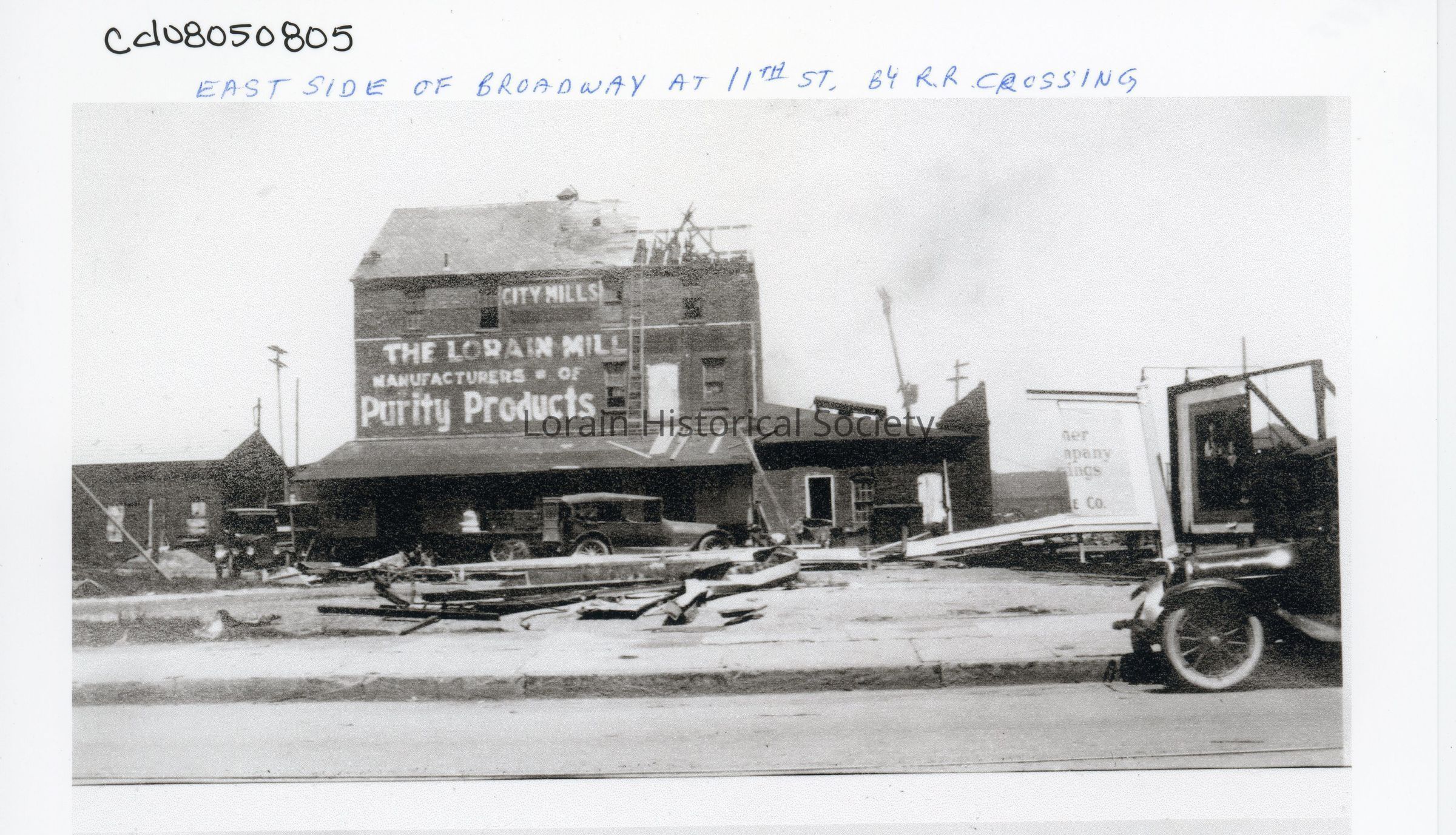 Photograph is black and white view of The Lorain Mill & Supply Co. Inc., 1633 Broadway, showing damage and debris from 1924 Tornado.