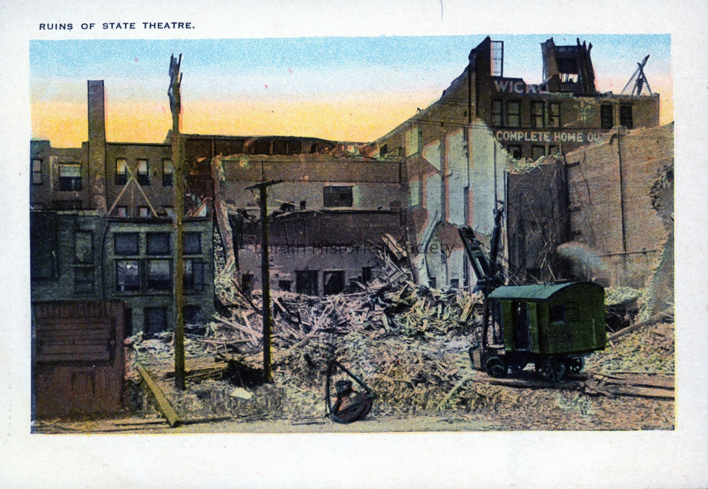 Souvenir booklet page is color view of ruins of State Theater, 375 Broadway, showing complete destruction from 1924 Tornado. Souvenir booklet page reads: "RUINS OF STATE THEATRE".Acquisition