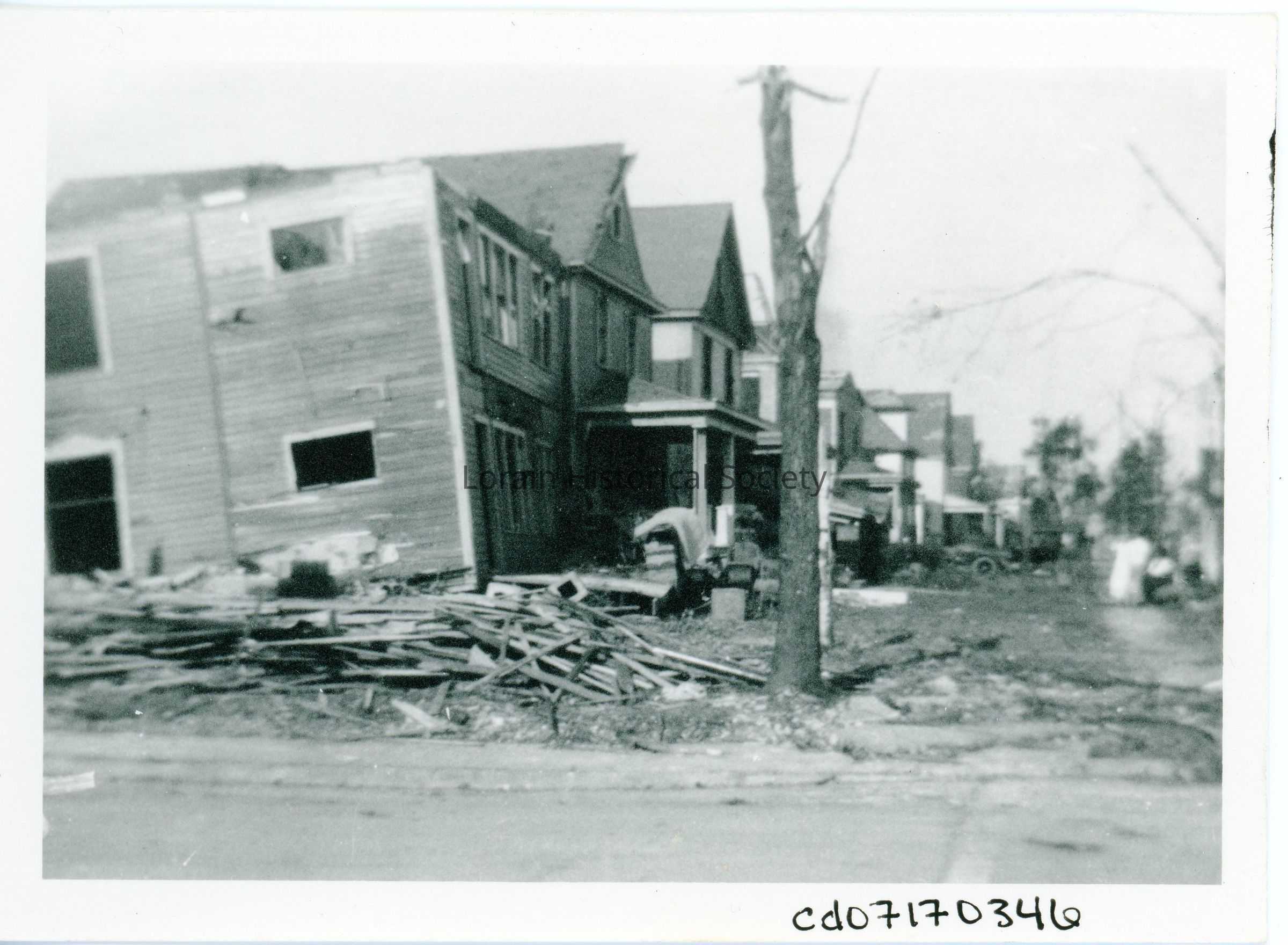 Photograph is black and white view of houses on West Ninth Street and Lexington Avenue, looking East, showing damage and destruction from 1924 Tornado. L to R: 338 West Ninth Street, Lean and Walter Bonsor (Bonsor & Son Construction), Home; 332 West Ninth Street, Alice and Lott Pettit Home (Lott was a Lorain City Fireman); 330 West Ninth Street, Mrs. Catherine Horn and Mrs. Ella Sinclair Home; 326 West Ninth Street, Dorothy and Fee Coyle and Gladys and Edward Riffle Home; 322 West Ninth Street, Mary and John Hilpert Home; 318 West Ninth Street, Elizabeth and Conrad Hageman Home; 316 West Ninth Street, Alice and Jacob Fisher Home.Acquisition