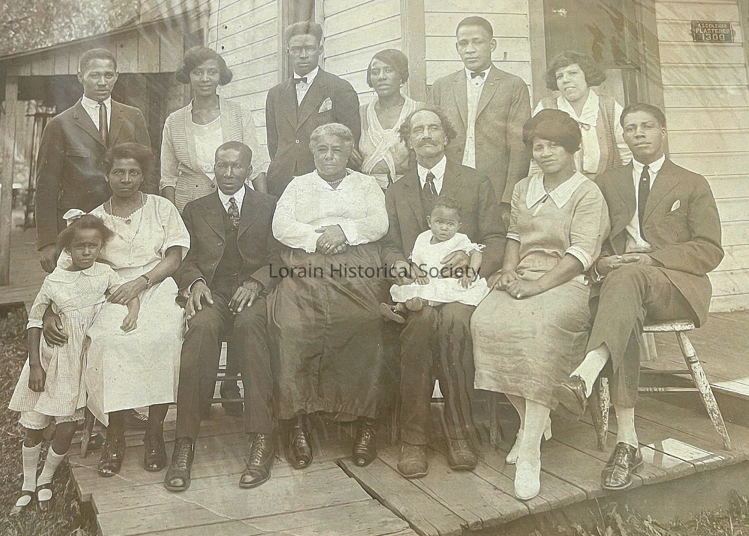 The Coleman family in front of the home he built at 1309 9th street ( near 9th and Brownell), then known as Elm Street. Asa Coleman (center front holding a baby) and his sons owned and operated a plastering company in Lorain.Collection