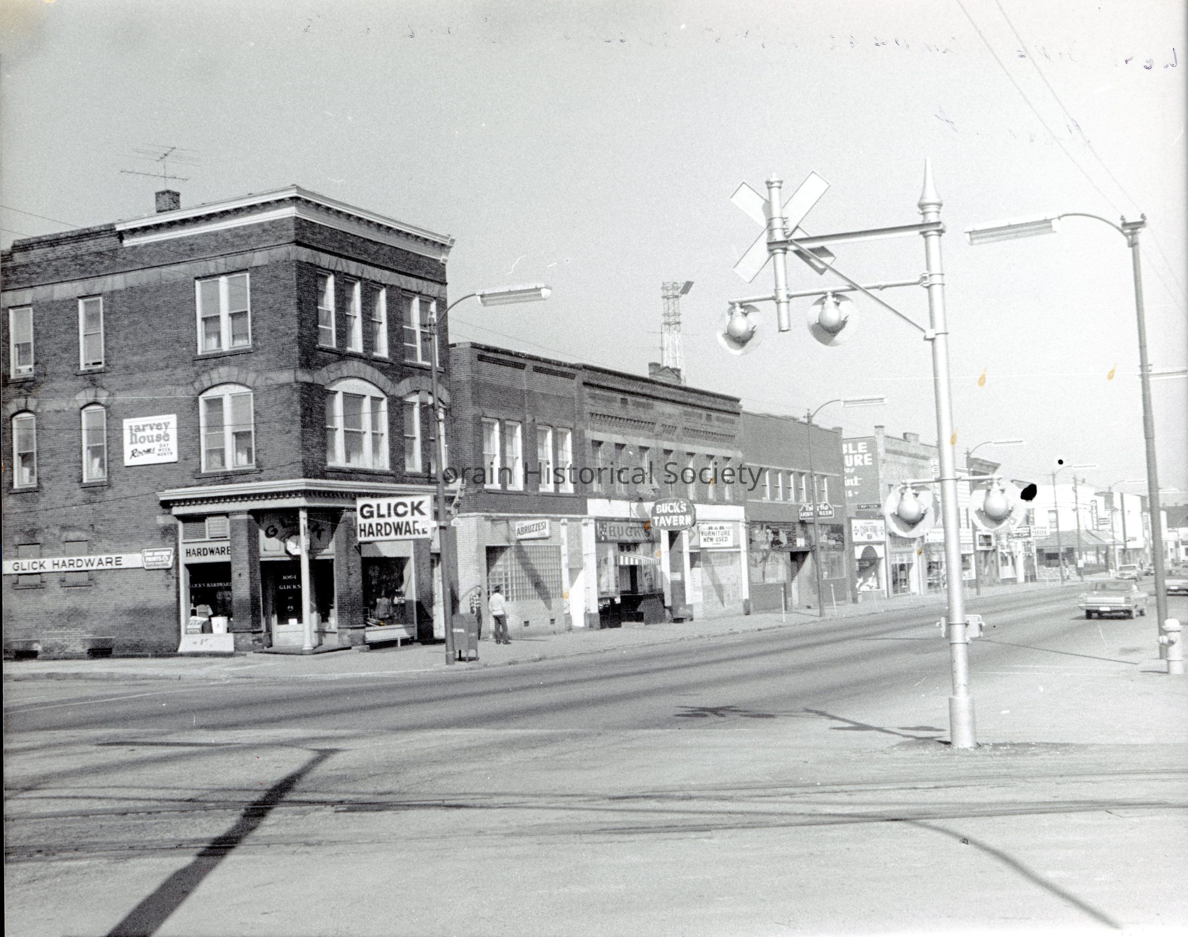 Photo on the northwest corner of 11th and Broadway. Featuring Glick Hardware on the corner, but also Harvey House Rooms, Abruzzesi Club, Buck's Tavern, R & B Furniture, Tally-Ho Liquor and Beer, and more that aren't legible. Circa 1960s