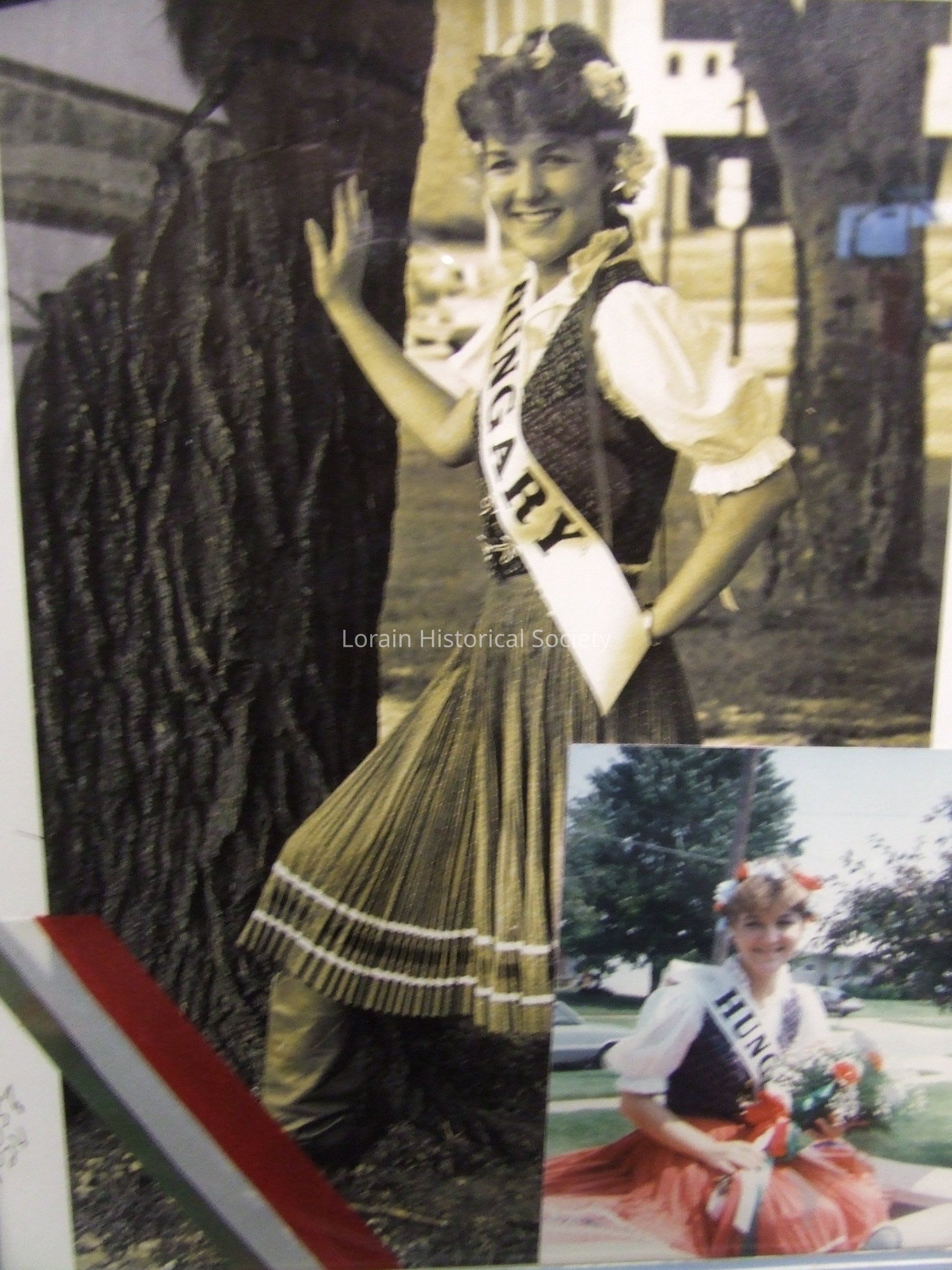 A collage photograph of the donor Amy-Jo West (Clark) as a Hungarian International Festival Princess, in 1986. There is a larger black and white 8 x10" photograph of Amy-Jo and a smaller color photograph of her in the corner. There is a small red, white, and green ribbon in the left bottom corner. The small color image has become stuck to the glass from the frame it was in and cannot be removed without causing damage; therefore the collage is being stored with glass attached. 08/24/2016 Goss, KaitlynCollection