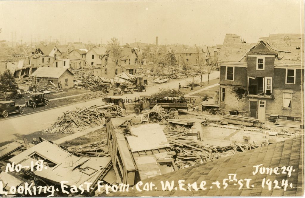 Postcard is view of unidentified houses looking east from the corner of West Erie Avenue and West Fifth Street, showing damage, destruction and debris from 1924 Tornado.