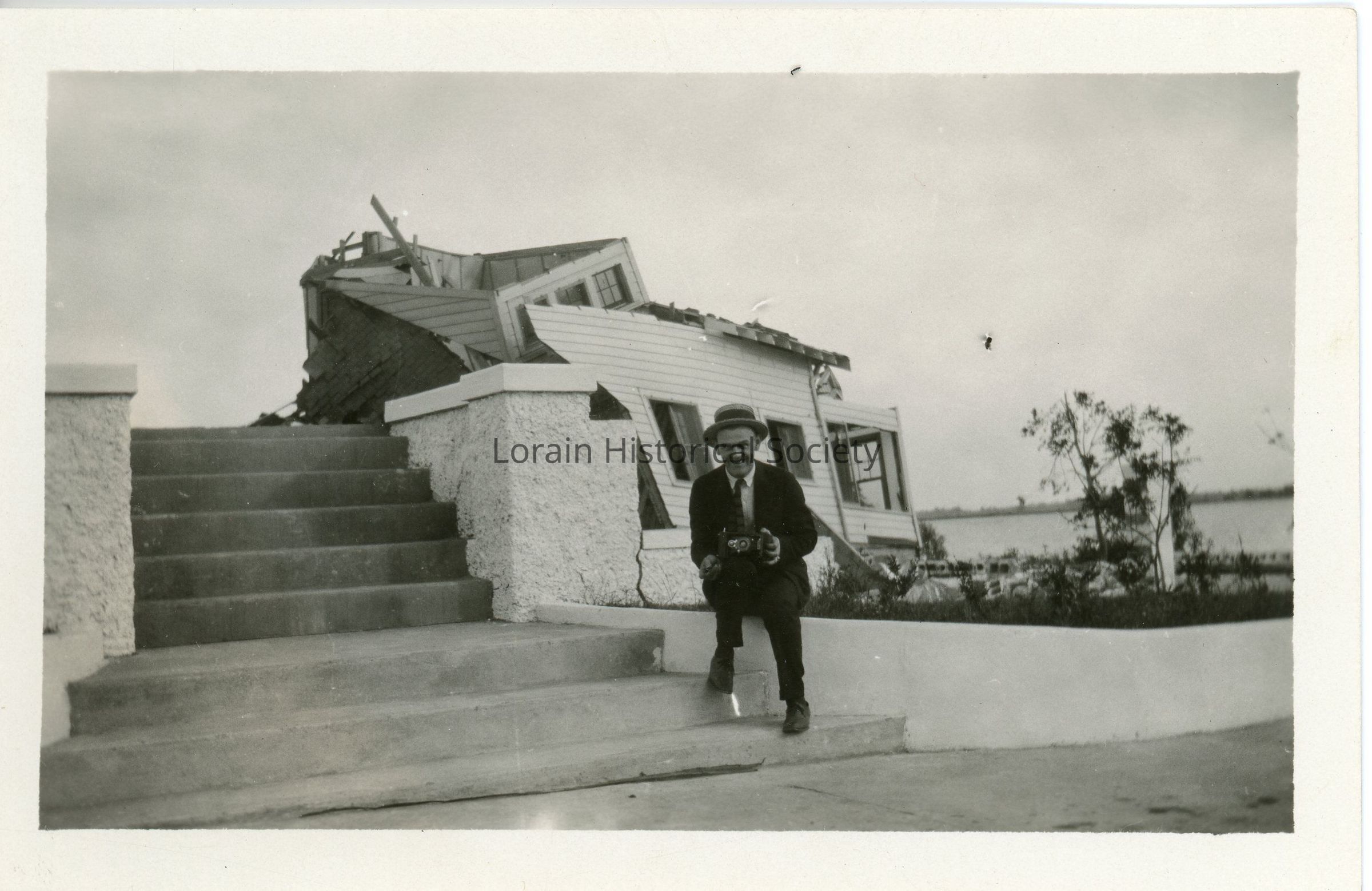 Photograph is black and white view of unidentified house showing damage and destruction from 1924 Tornado. Unidentified man sitting on wall in front.Acquisition