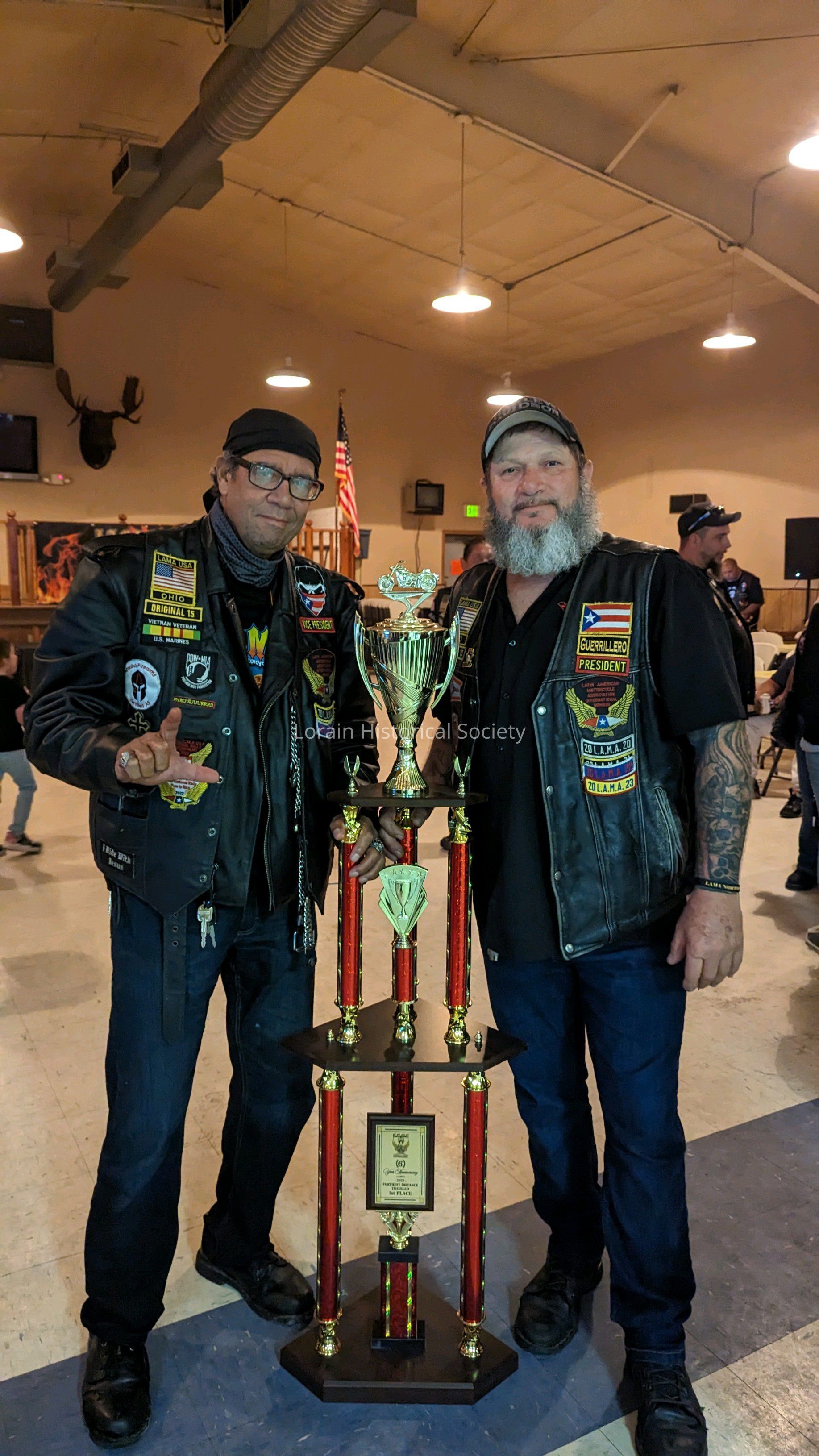 Photo of Antonio Barrios (left) and another Latin American Motorcycle Association (L.A.M.A.) member posing with a trophy awarded to the Lorain chapter of L.A.M.A. in 2023.The chapter received 1st place in "Furthest Distance Traveled."Collection