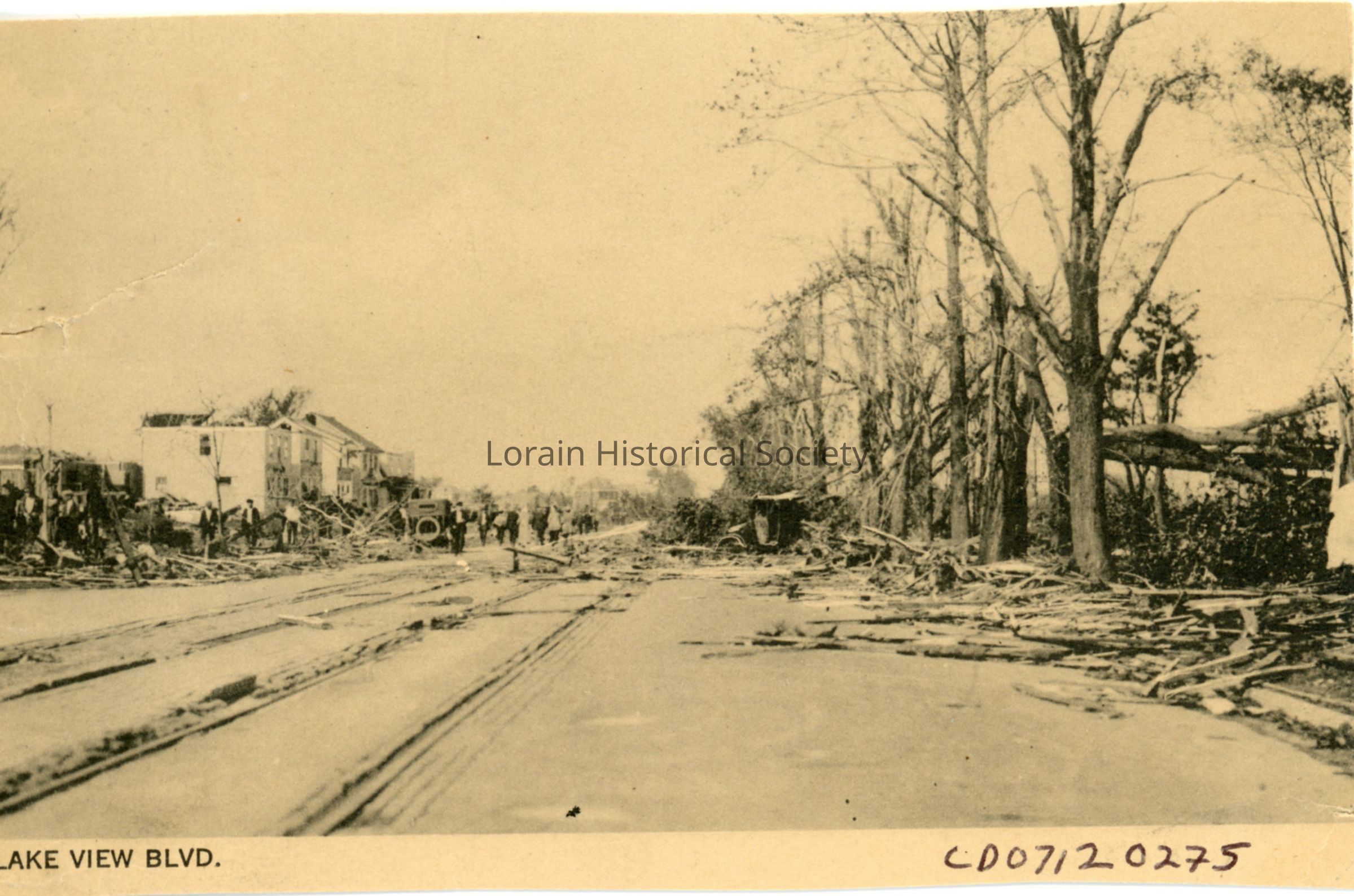 Postcard print is view of houses on West Erie Avenue showing damage and destruction from 1924 Tornado. Postcard print reads: "LAKE VIEW BLVD.".Acquisition