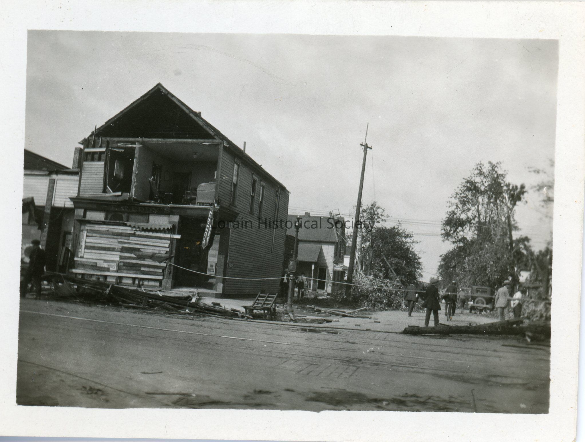 Photograph is black and white view of unidentified building and houses showing damage and destruction from 1924 Tornado.Acquisition