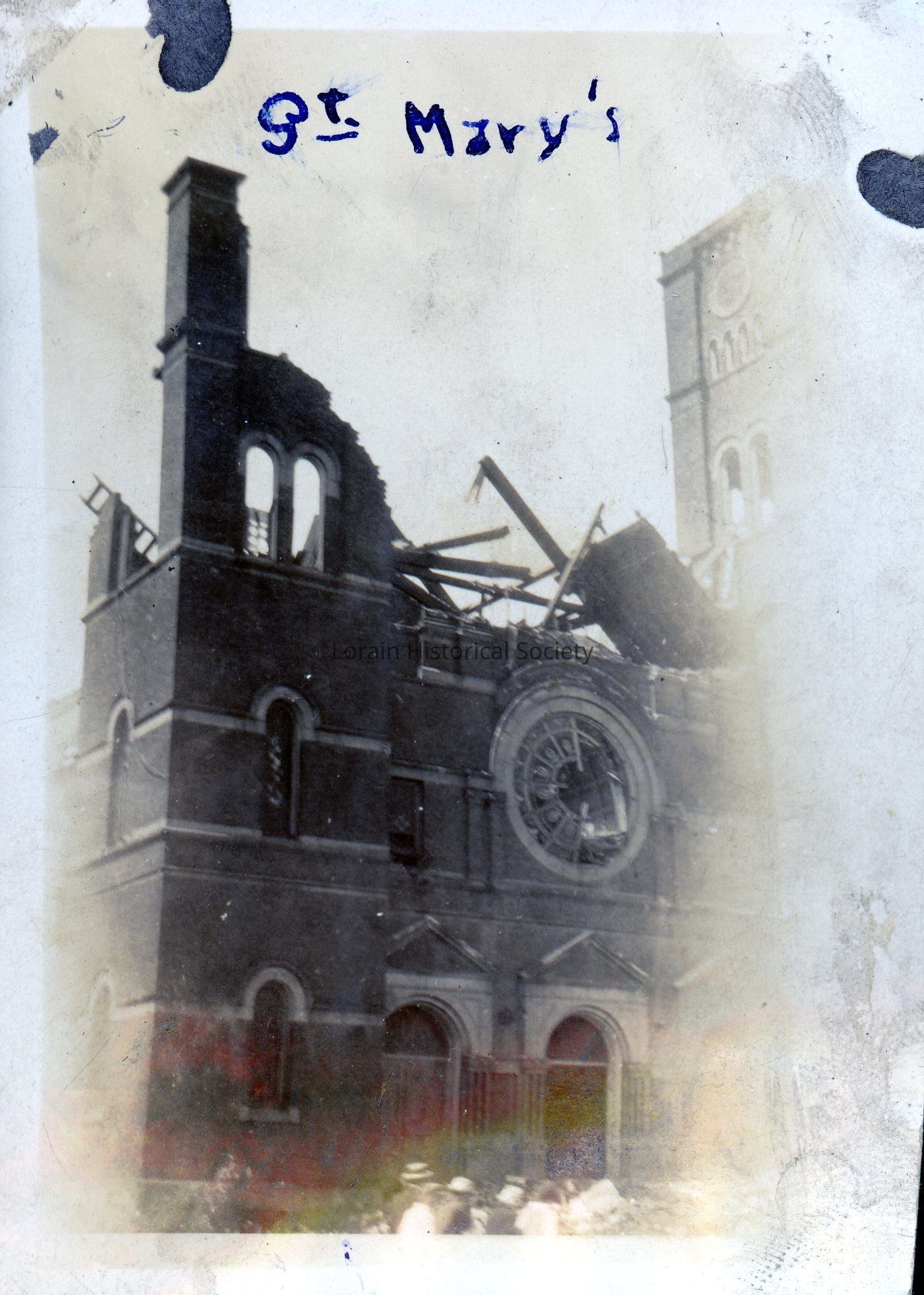 Photograph is black and white view of Saint Mary Roman Catholic Church, 300 West Eighth Street, showing damage and destruction from 1924 Tornado.