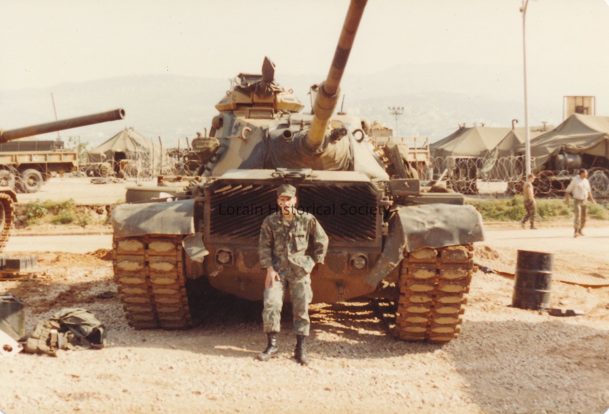 Photo of Arvin Morell standing in front of a tank in Lebanon in the early 1980s. Arvin served in the U.S. Marine Corps between 1980 and 1984 and participated in military peace-keeping operations in Lebanon during the Lebanese Civil War.Collection