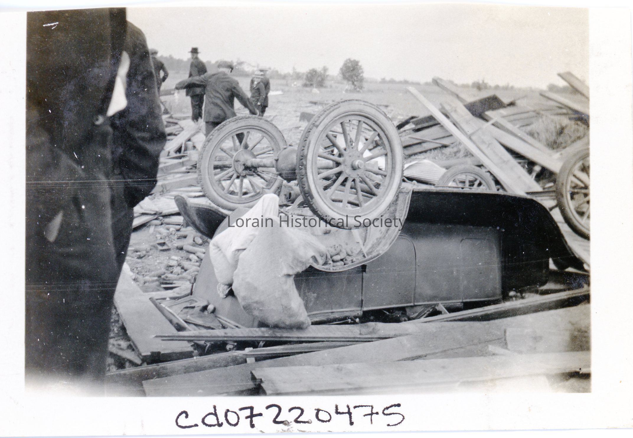 Photograph is black and white view of overturned automobile surrounded by debris and unidentified men viewing damage and destruction from 1924 Tornado.Acquisition