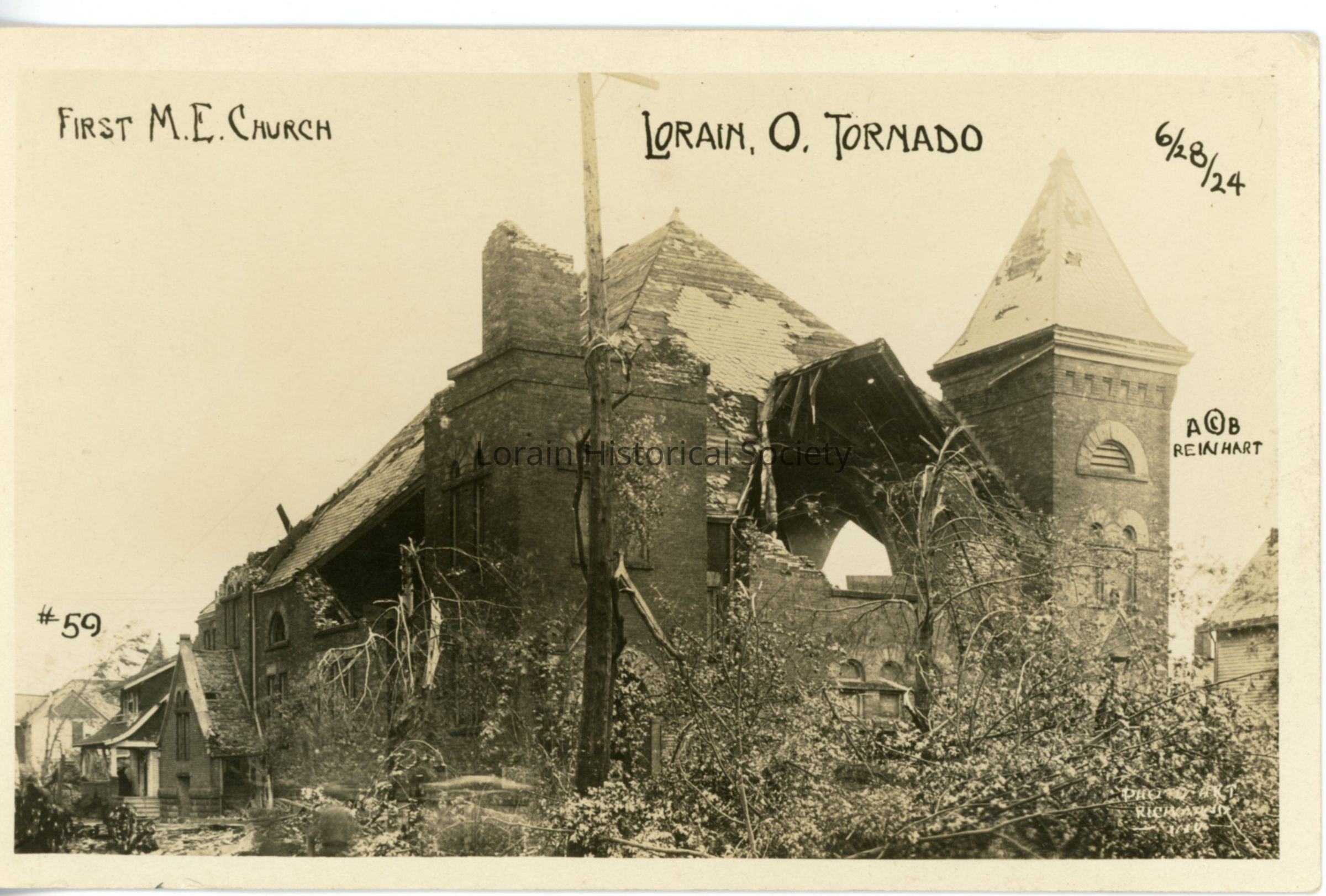 Postcard is view of First Methodist Episcopal Church showing damage after 1924 Tornado. Postcard reads: "FIRST M. E. CHURCH LORAIN, O. TORNADO 6-28-24 #59 A. B. REINHART PHOTO ART RICHMOND, IND."Acquisition