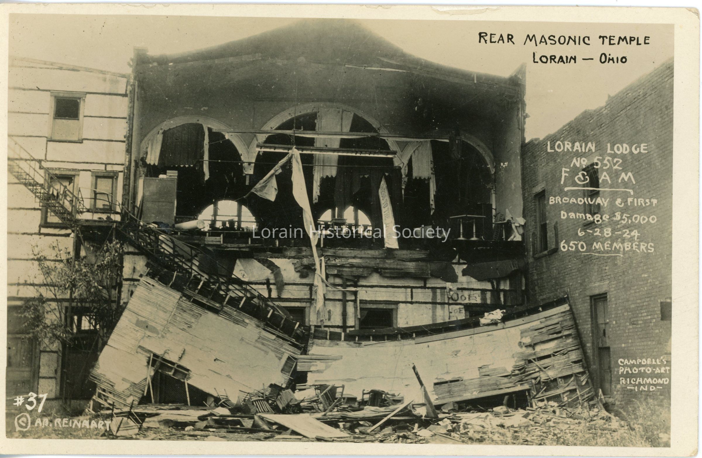 Postcard is view of rear of Masonic Temple, 675 Broadway. showing damage and debris after 1924 Tornado. Postcard reads: "REAR MASONIC TEMPLE LORAIN -- Ohio LORAIN LODGE No. 552 F & A M BROADWAY & FIRST Damage $5,000 6-28-24 650 Members #37 A. B. REINHART CAMPBELL'S PHOTO ART RICHMOND IND".Acquisition