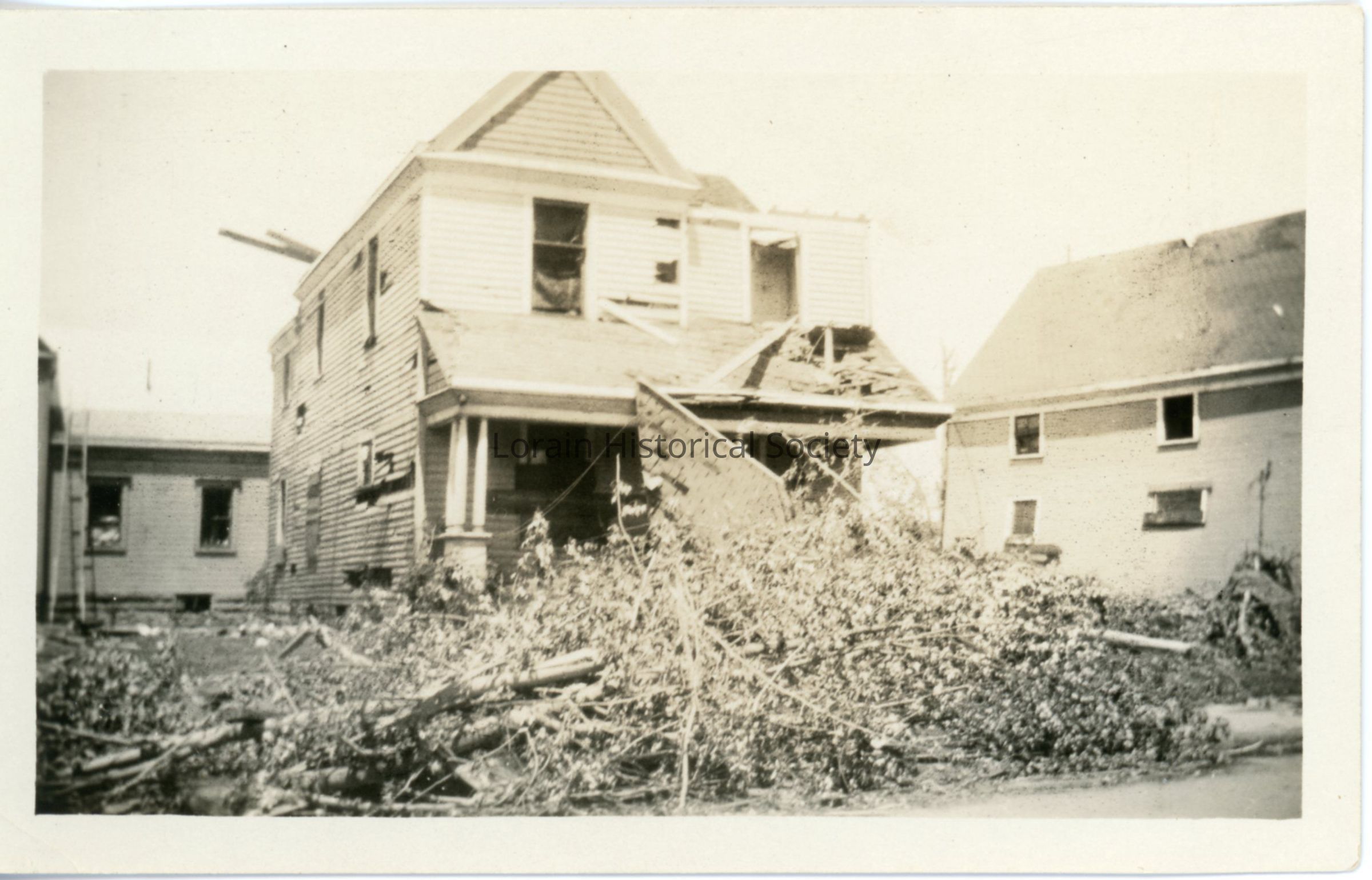Photograph is black and white view of unidentified houses showing damage, destruction and debris from 1924 Tornado. Landscape debris in front of center house.Acquisition