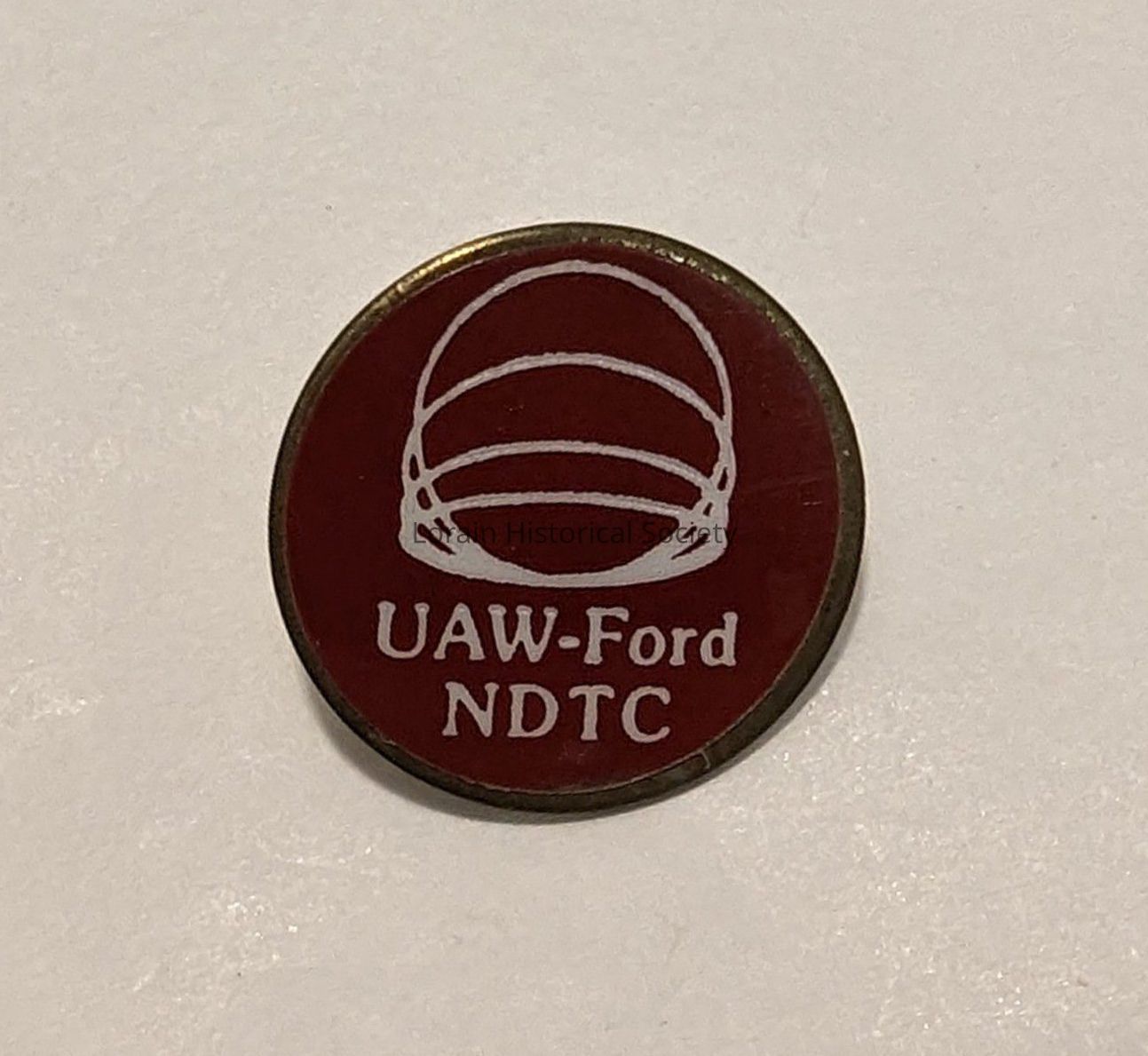 Small round pin/tie tack; gold with red enamel; UAW-Ford NDTC (National Development & Training Center)