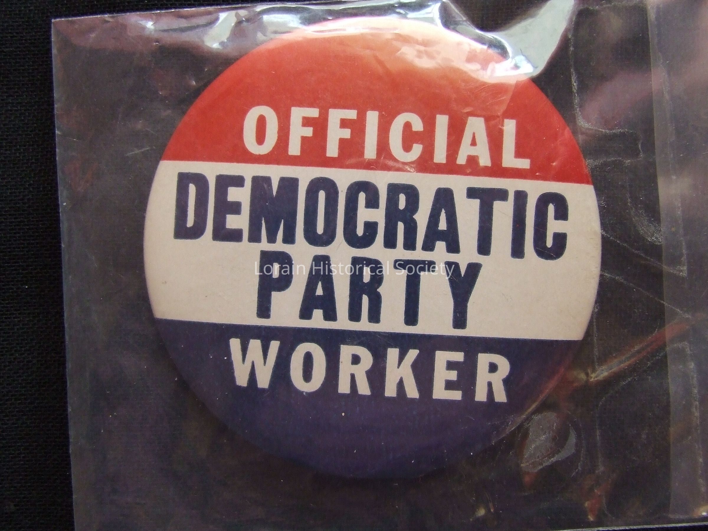 Button given to John Milas when John F. Kennedy campaigned in Lorain in 1960 at George Danley Stadium. (original description says 1961 and 1959; however, JFK was in Lorain in 1960 so the description has been changed to reflect that. KTD 7-30-2024).