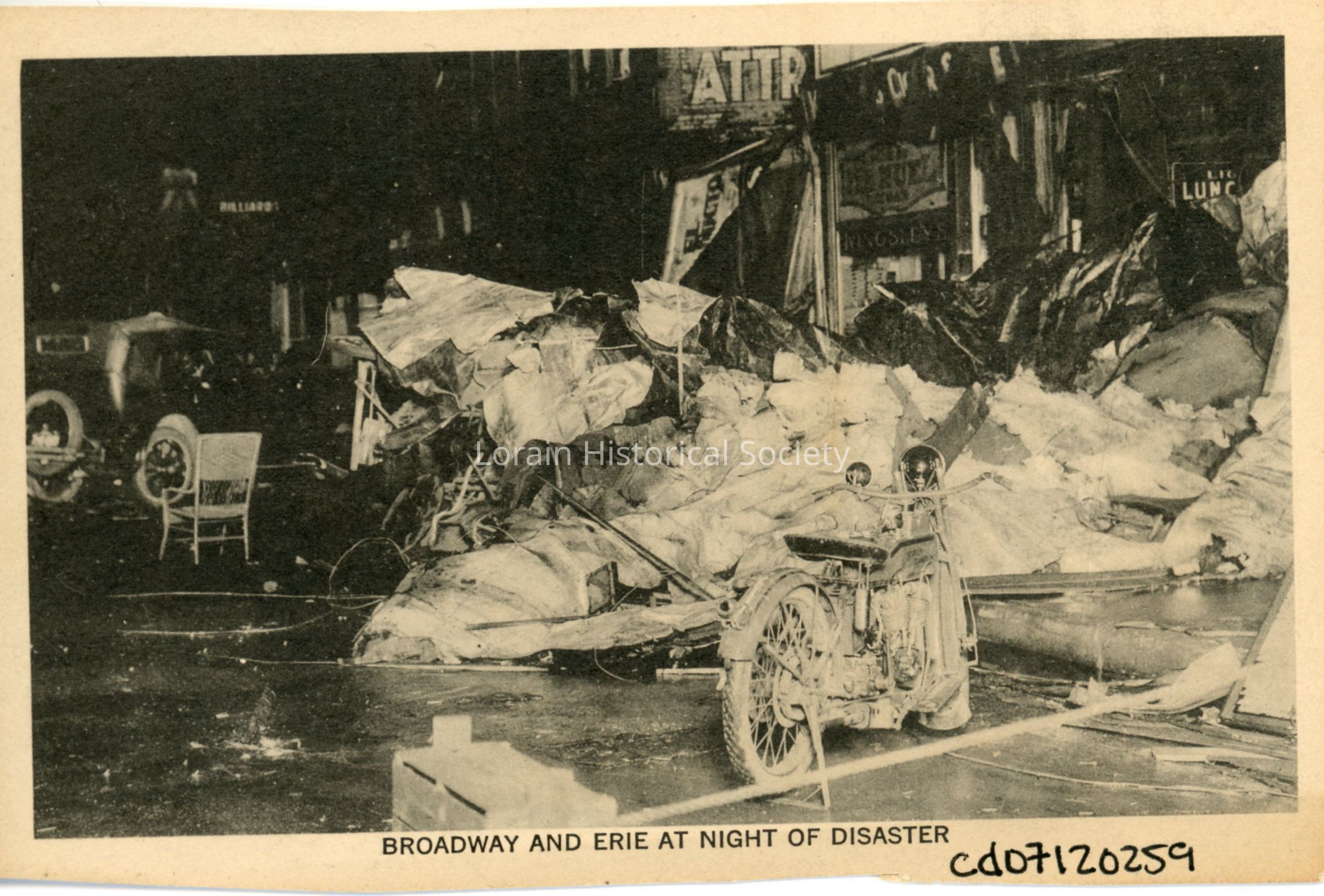 Postcard print is view of Broadway and West Erie Avenue on night of 1924 Tornado, showing damage and automobile under debris. Postcard print reads: "BROADWAY AND ERIE AT NIGHT OF DISASTER".Acquisition