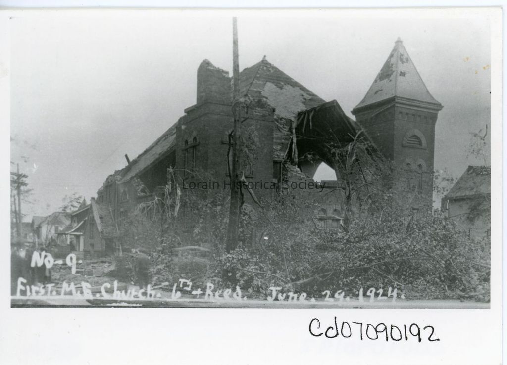 Photograph of postcard is black and white view of First Methodist Episcopal Church, 224 West Sixth Street, showing damage, destruction and debris from 1924 Tornado.