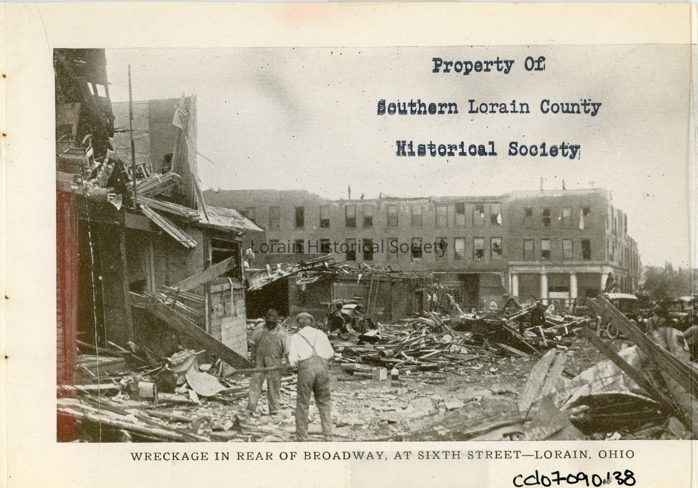 Souvenir booklet page is black and white view of debris and wreckage at rear of Broadway at West Sixth Street after the 1924 Tornado. Souvenir booklet page reads: "WRECKAGE IN REAR OF BROADWAY, AT 6TH STREET--LORAIN, OHIO".Acquisition