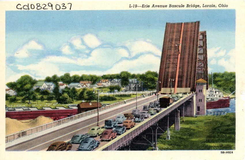 08/25/2021 AMS: cd0829037. Color Postcard is view of open Bascule Bridge with shipe going through and stopped traffic. Postcard reads: "L19--Erie Avenue Bascule Bridge, Lorain, Ohio." 4 copiesAcquisition
