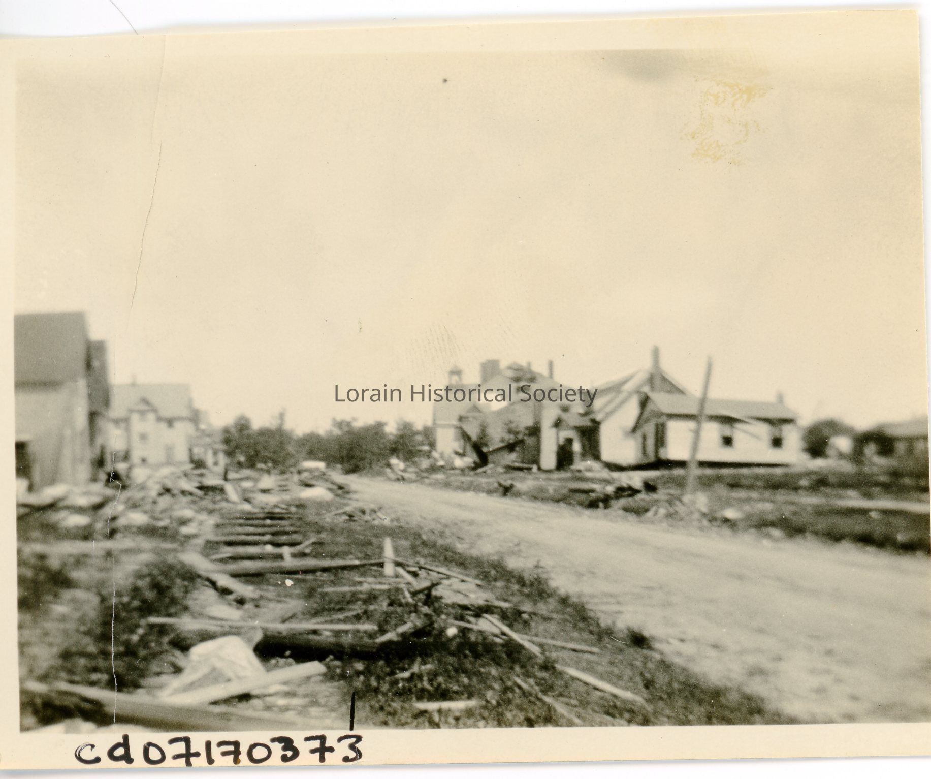 Photograph is black and white view of unidentified houses on country road showing damage and destruction from 1924 Tornado. (Might be Sheffield Village.)Acquisition