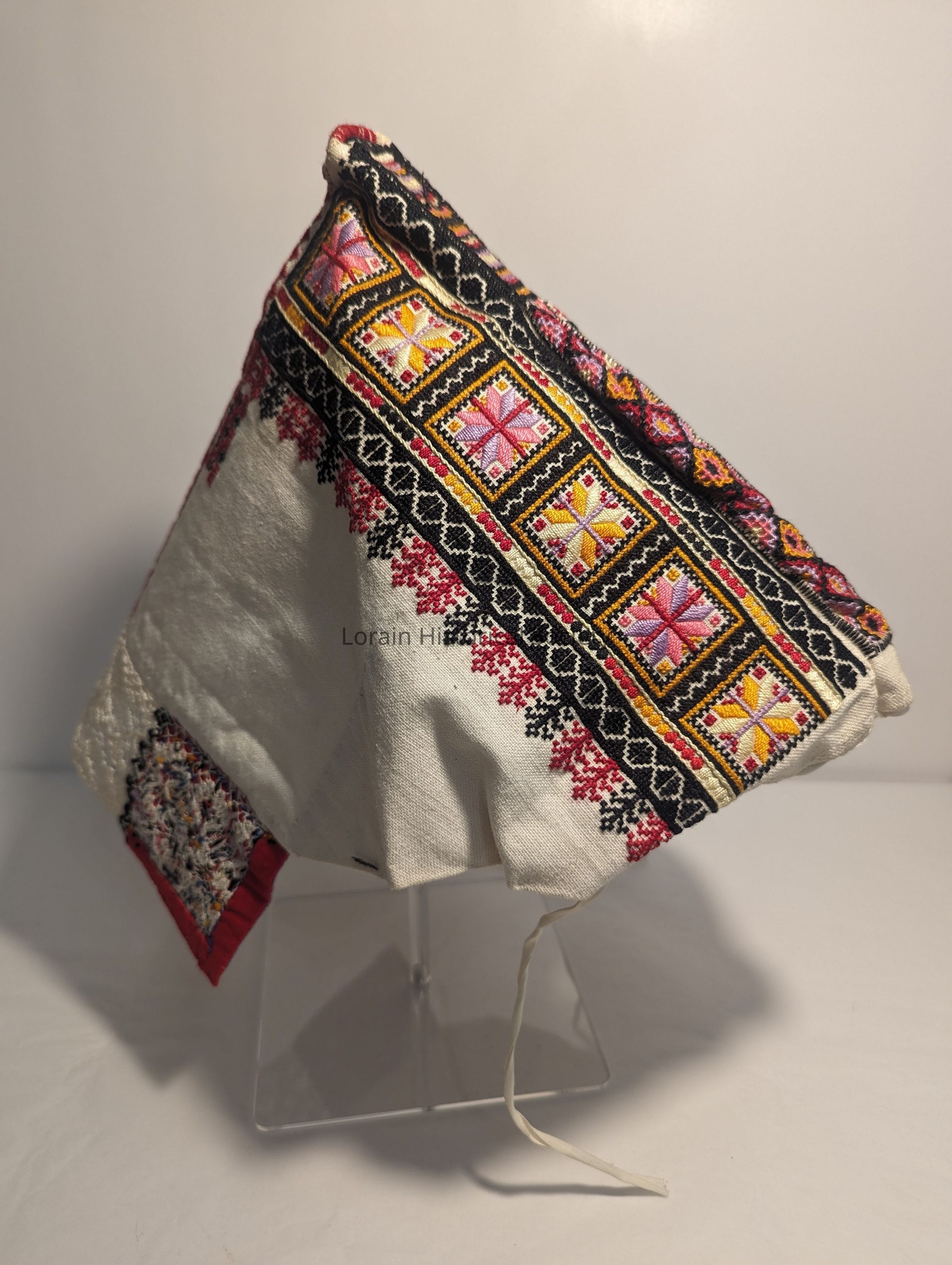 A southern Hungarian headpiece, The headpiece is multicolored the colors on the headpiece are; pink, orange, purple, black, red, and white. The headpiece is under glass in a frame.
