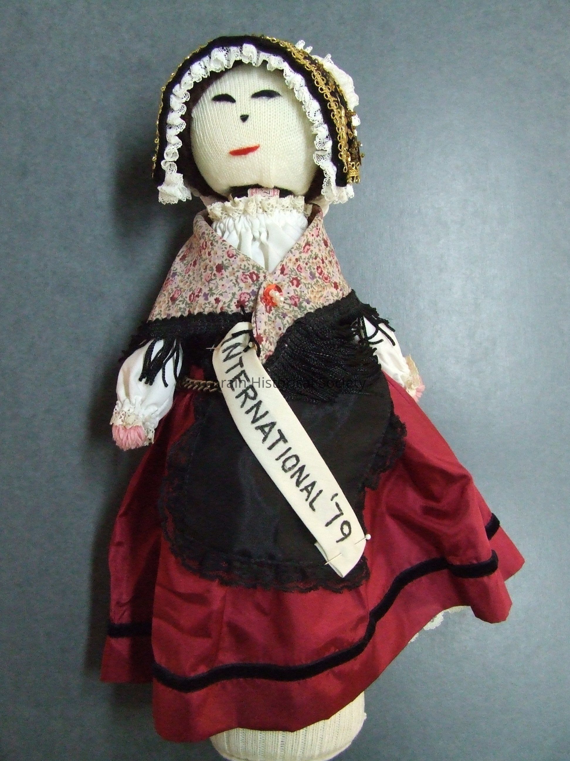 A handmade Slovenian doll. The doll's core is a glass bottle and head, arms, clothes are made of fabric.Collection