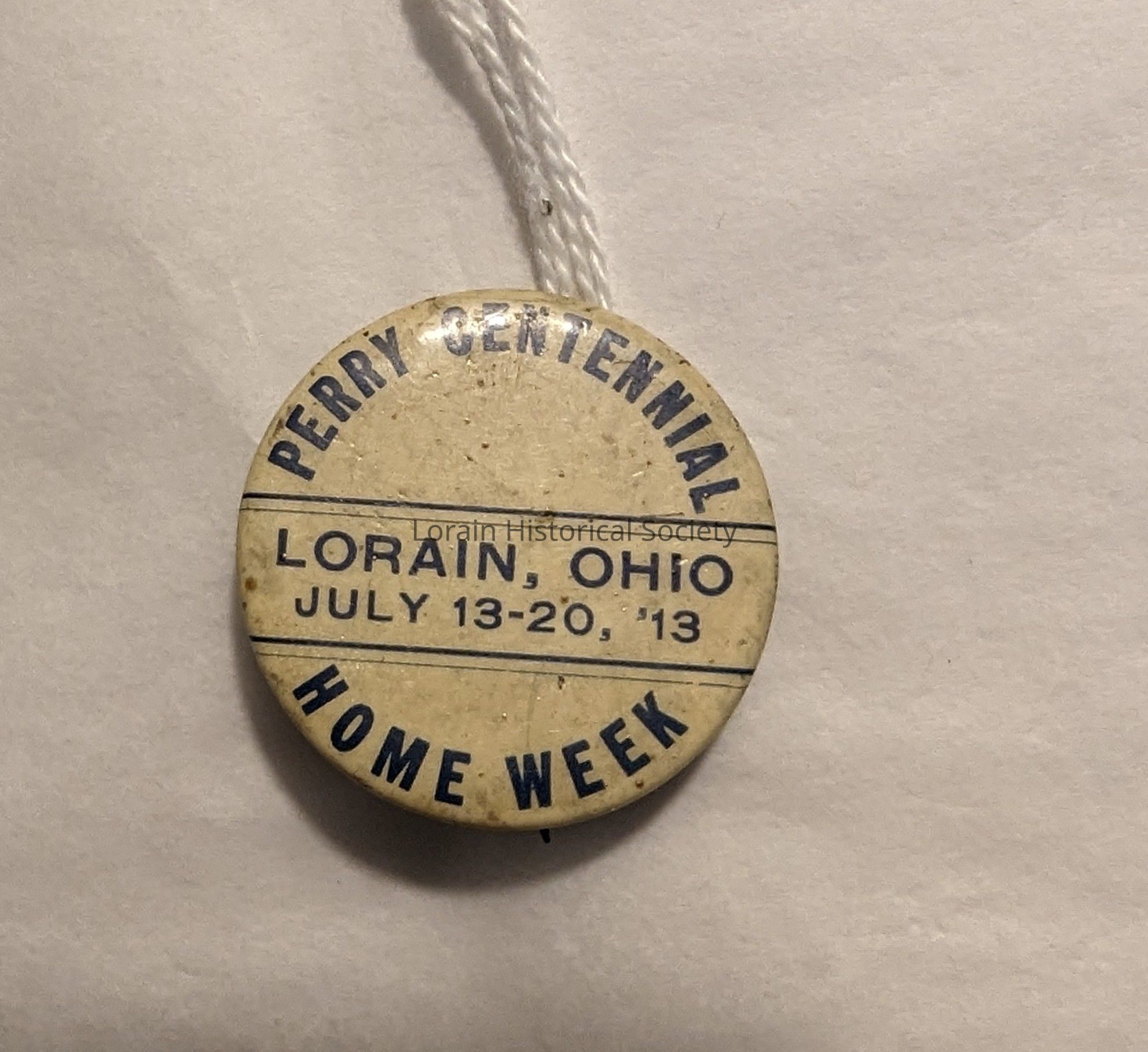 On the front of the pin blue lettering reads "Perry Centennial Home Week" around the top and bottom of the pin. In the very center of the pin in blue lettering it reads "Lorain, Ohio July 13-20, '13". The middle part of the pin is sectioned off by two blue lines (separating the top and bottom of the pin in a way).