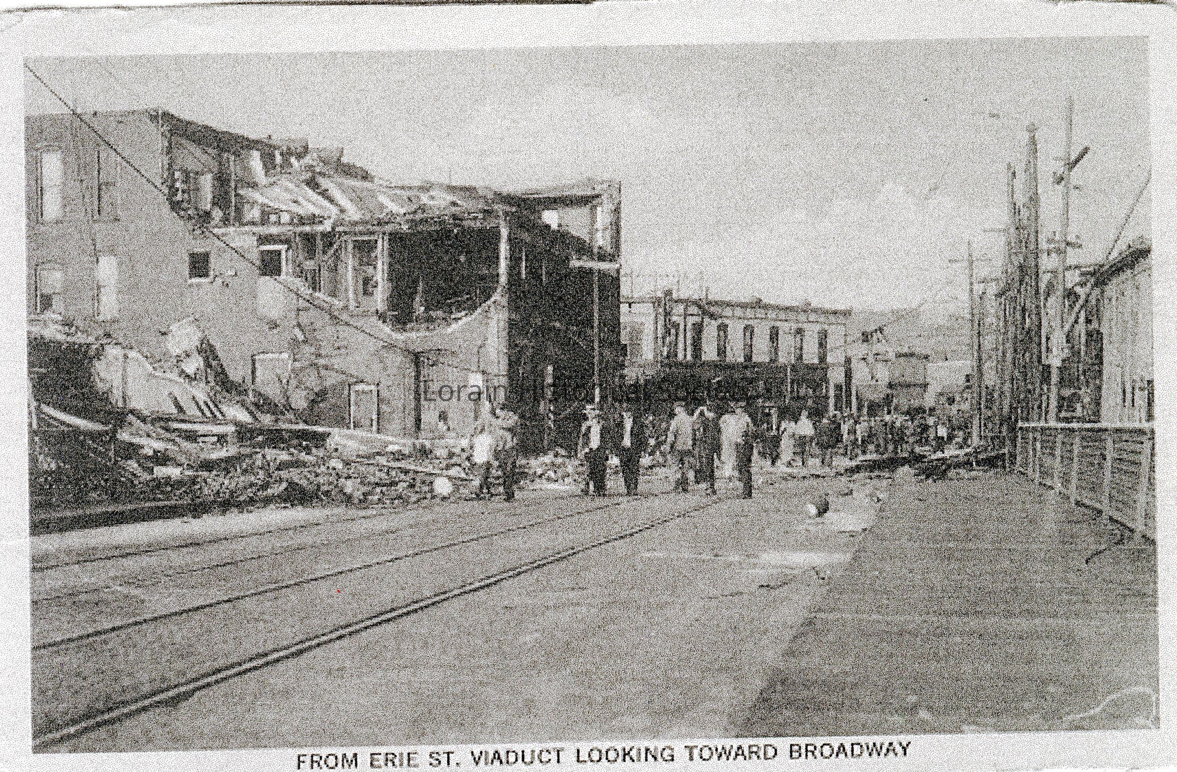 Black and white postcard photocopy is view of Broadway looking south from Erie Avenue Viaduct showing damage from 1924 Tornado. Postcard reads: "From Erie St. Viaduct Looking Toward Broadway".Acquisition