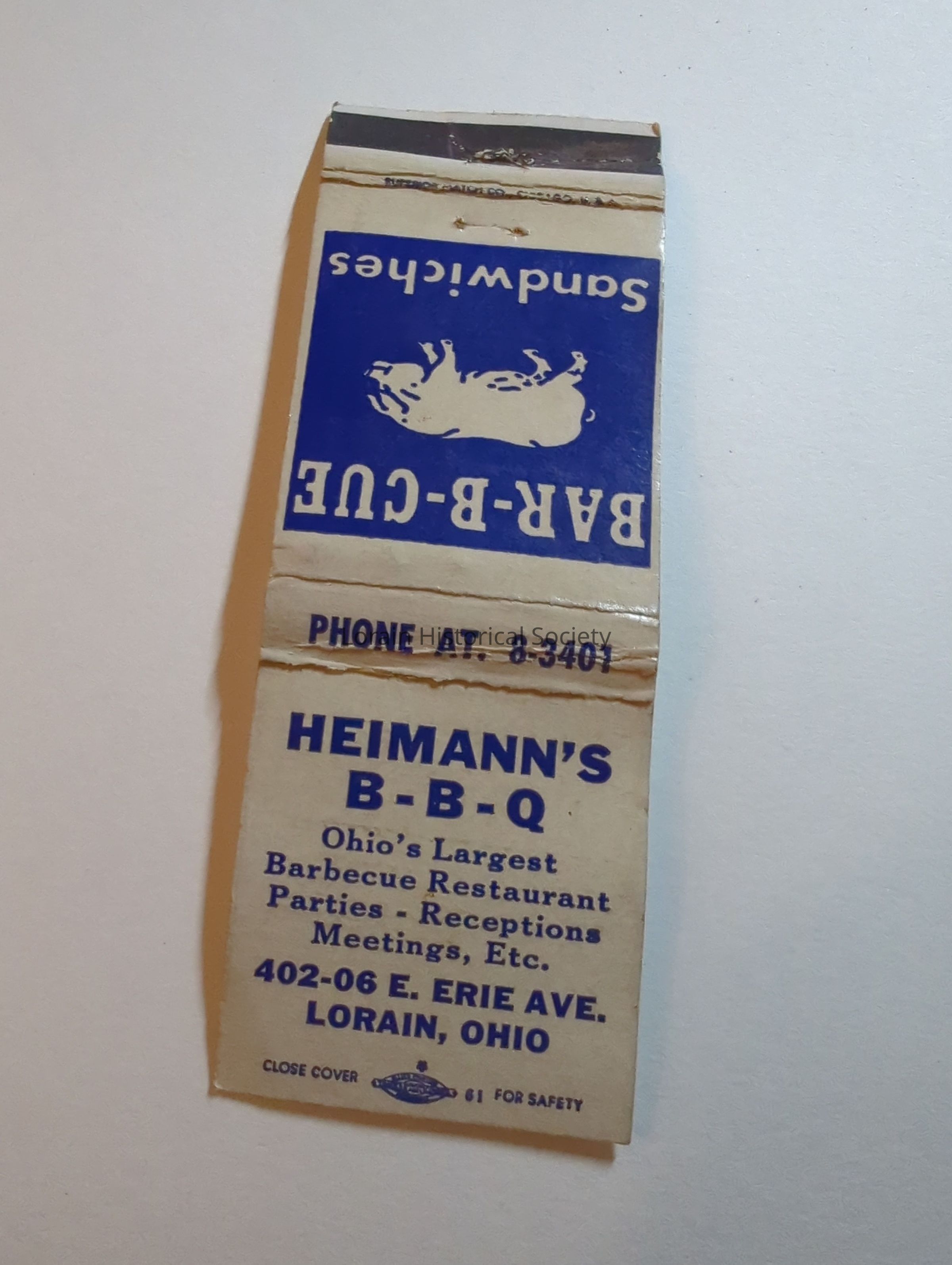 A white matchbook with blue print from Heimann's B-B-Q in Lorain, OH. 402-06 East Erie Avenue