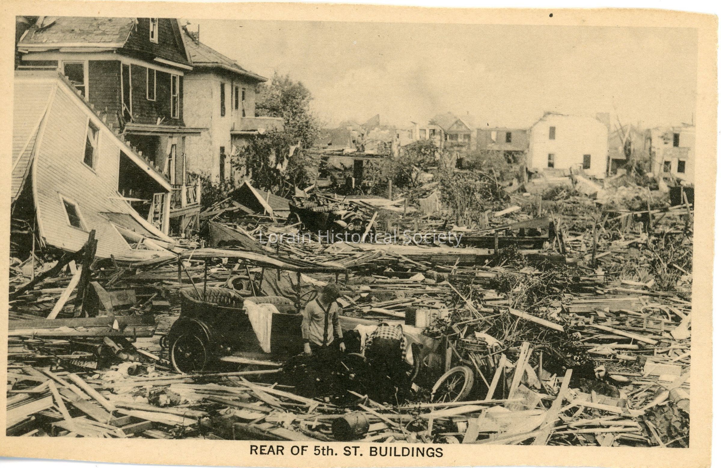 Postcard print is view of damage and destruction of houses from rear of West Fifth Street. Postcard print reads: "REAR VIEW OF 5th ST. BUILDINGS".Acquisition