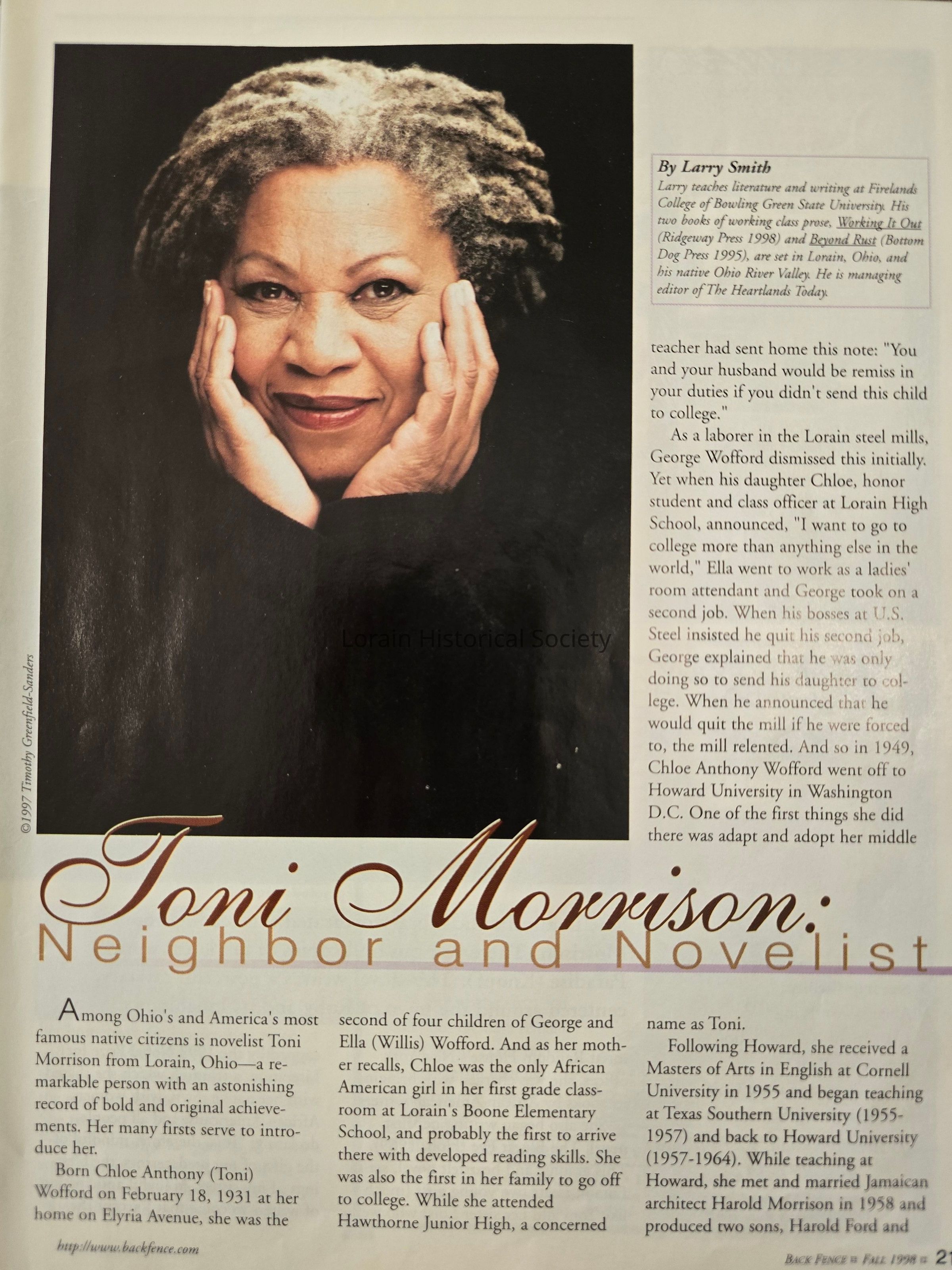 "Over the Back Fence" magazine, Fall 1998, with article, "Pride of Lorain: Toni Morrison: Neighbor and Novelist -- This Pulitzer Prize winner still finds inspiration in her memories of Northern Ohio."Acquisition