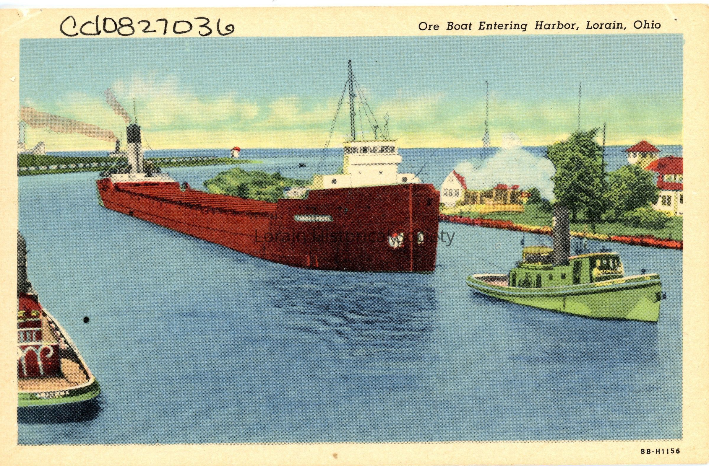 cd0827036. 07/14/2021. Color postcard showing ore boat entering Lorain harbor. Postcard reads: "Ore Boat Entering Harbor, Lorain, Ohio". 3 copies.