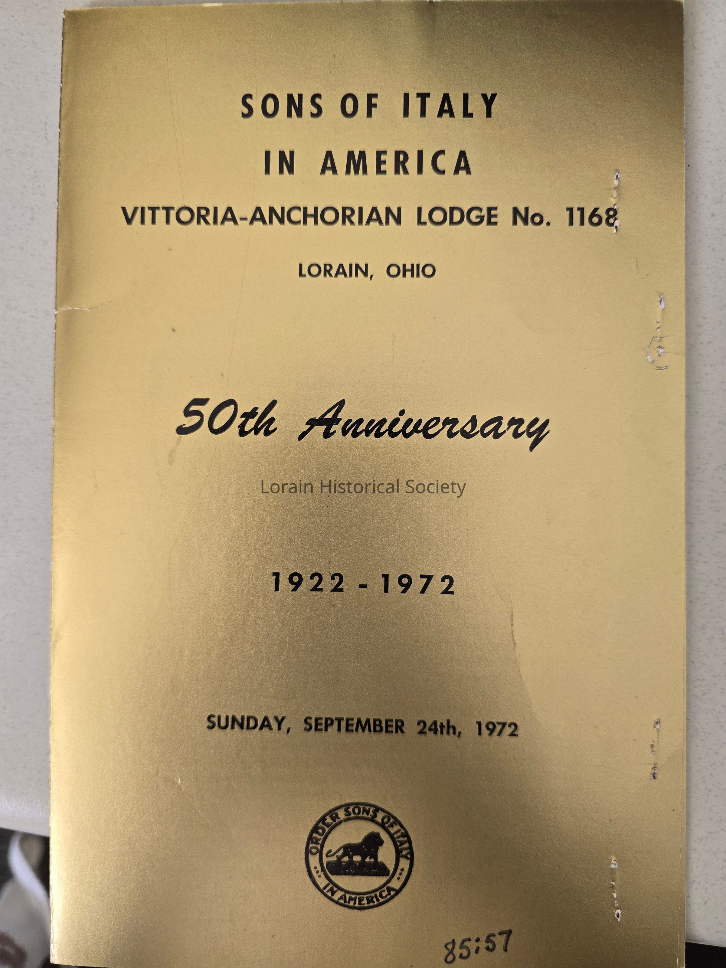 Program for Sons of Italy in America. Vittoria-Anchorian Lodge No. 1168. 50th Anniversary, 1922 - 1972. Sunday, September 24th, 1972. (2 copies in file).Acquisition