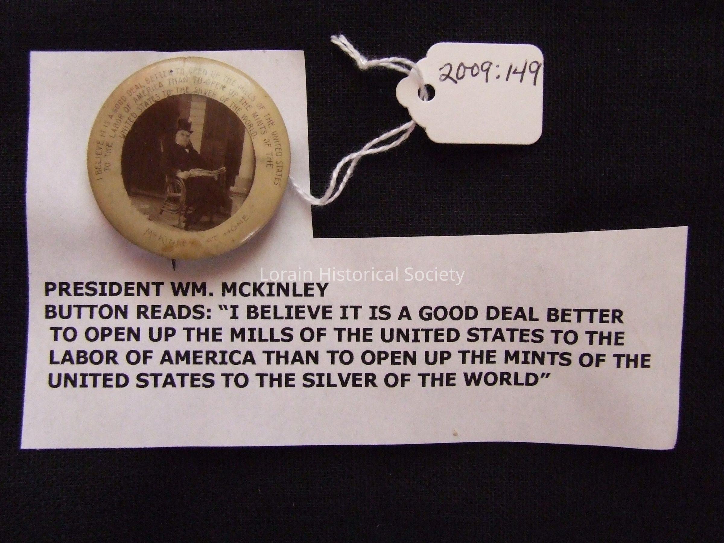 It is made by Novelty Button Co, Canton, OH - and in black (fading to gray) lettering it reads "I believe it is a good deal better to open up the mills of the United States to the Labor of America than to open up the mints of the United States to the silver of the world".