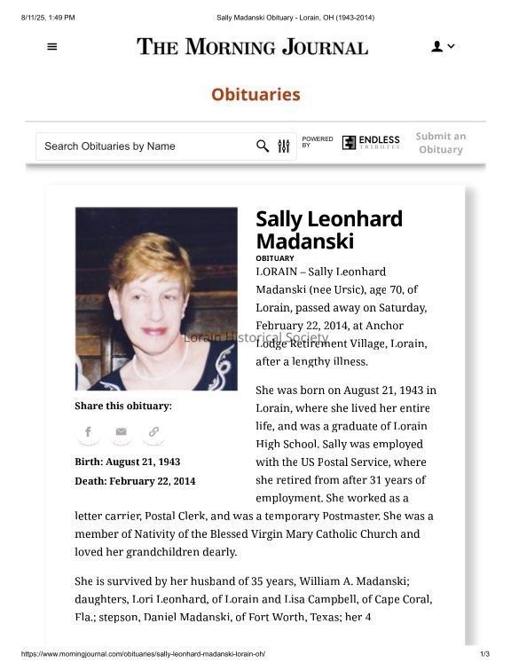 Ursic Madanski, Sally Leonhard Obituary - Lorain, OH (1943-2014)Scope and Content